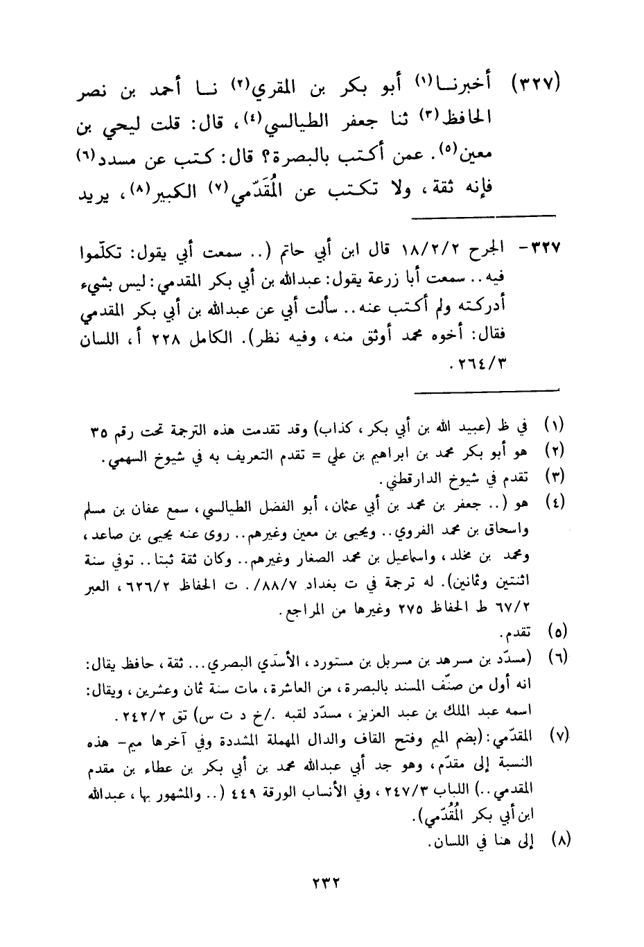 327 - أخبرنا أبو بكر بن المقري نا أحمد بن نصر الحافظ ثنا جعفر الطيالسي قال قلت ليحيى بن معين عمن أكتب بالبصرة قال اكتب عن مسدد فإنه ثقة ولا تكتب عن المقدمي الكبير يريد عبد الله بن أبي بكر فإنه كذاب