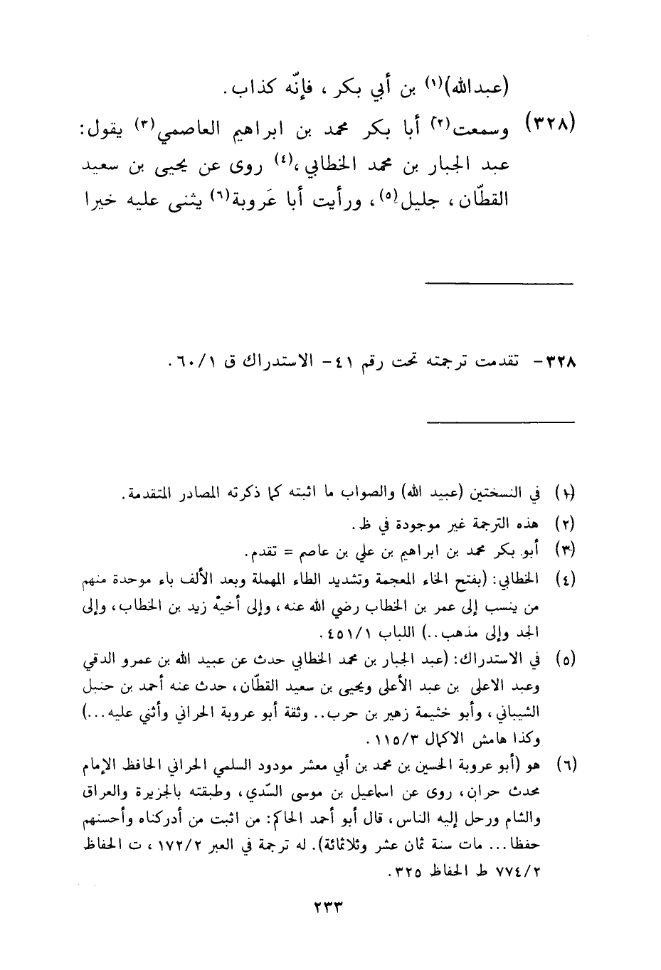 328 - وسمعت أبا بكر محمد بن إبراهيم العاصمي يقول عبد الجبار بن محمد الخطابي روى عن يحيى بن سعيد القطان جليل ورأيت أبا عروبة يثني عليه خيرا