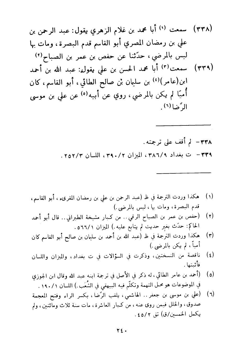 339 - سمعت أبا محمد الحسن بن علي يقول عبد الله بن أحمد بن عامر بن سليمان بن صالح الطائي أبو القاسم كان أميا لم يكن بالمرضي روى عن أبيه عن علي بن موسى الرضا