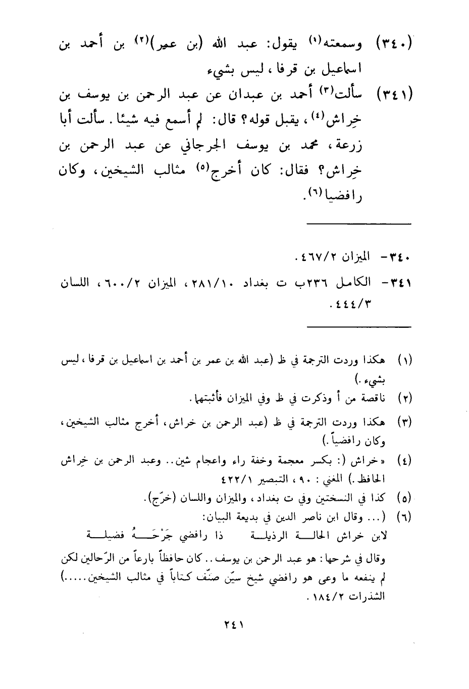 341 - سألت أحمد بن عبدان عن عبد الرحمن بن يوسف بن خراش يقبل قوله قال لم أسمع فيه شيئا سألت أبا زرعة محمد بن يوسف الجرجاني عن عبد الرحمن بن خراش فقال كان أخرج مثالب الشيخين وكان رافضيا