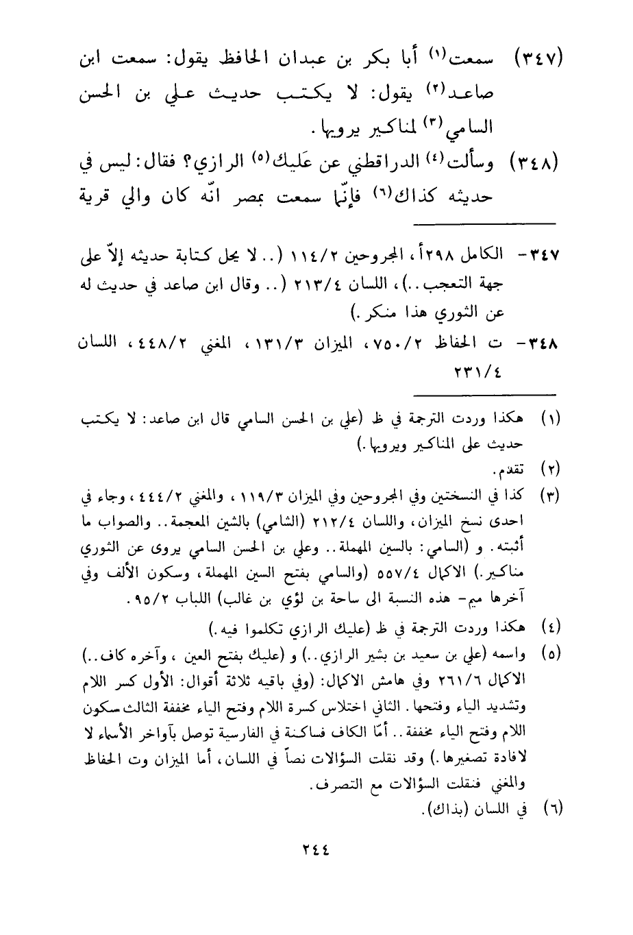 347 - سمعت أبا بكر بن عبدان الحافظ يقول سمعت بن صاعد يقول لا يكتب حديث علي بن الحسن السامي لمناكير يرويها