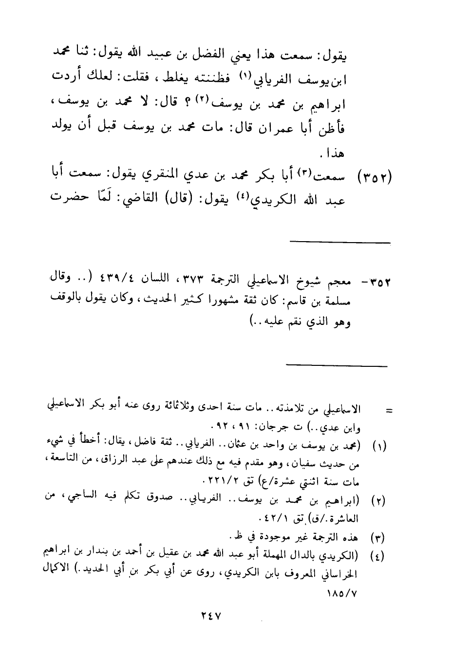 352 - سمعت أبا كبر محمد بن عدي المنقري يقول سمعت أبا عبد الله الكريدي يقول قال القاضي لما حضرت أبا خليفة الوفاة دعاني فقال قد جعلت كل من تكلم في في حل إلا من قال إني أقف في القرآن أقول القرآن كلام الله غير مخلوق