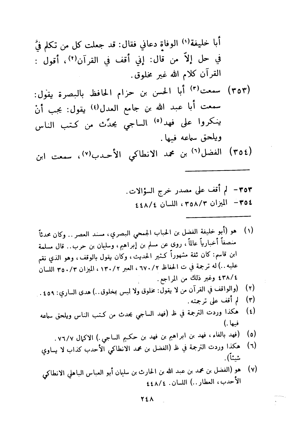 353 - سمعت أبا الحسن بن حزام الحافظ بالبصرة يقول سمعت أبا عبد الله بن جامع العدل يقول يجب أن ينكروا على فهد الساجي يحدث من كتب الناس ويلحق سماعه فيها