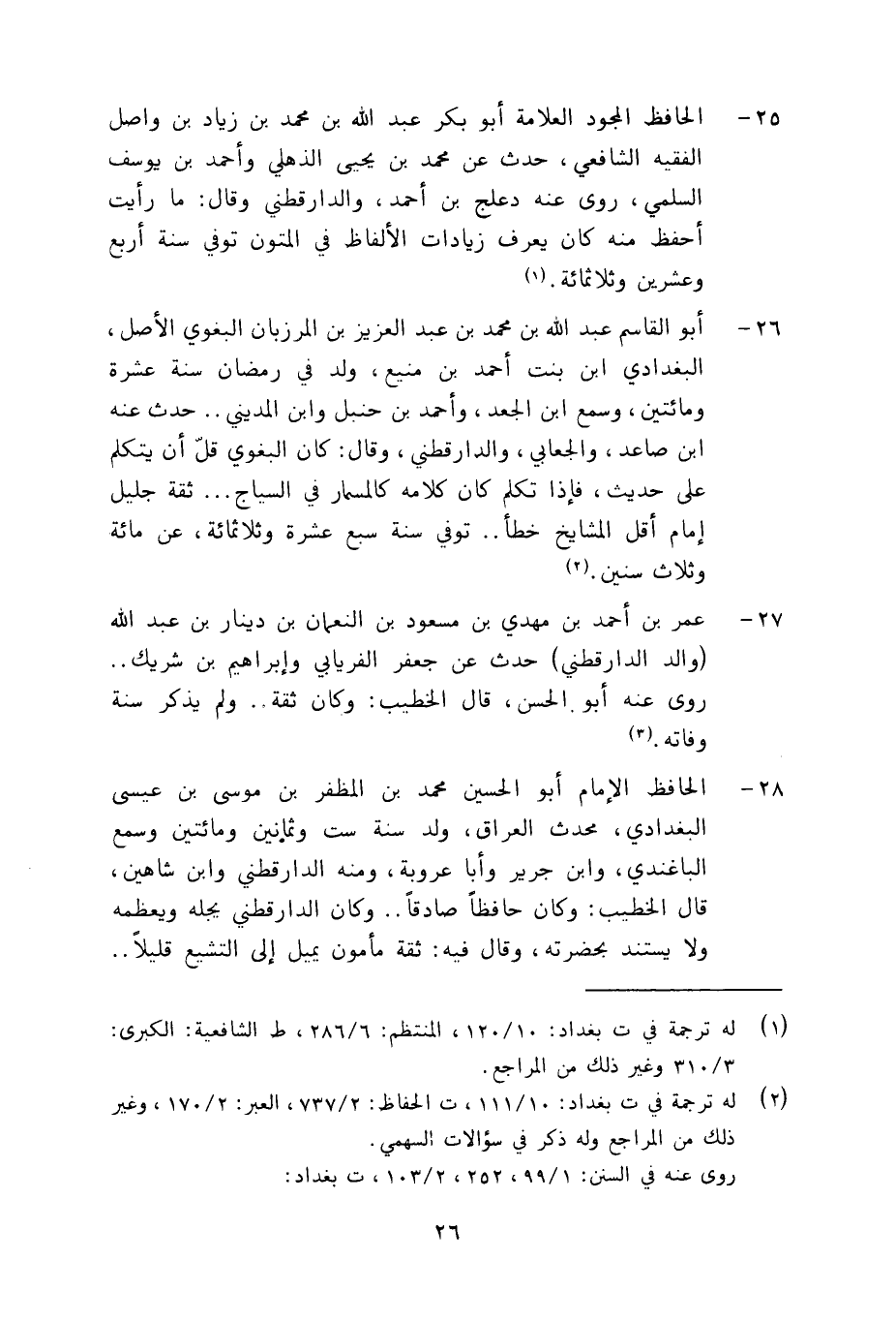 27 - عمر بن احمد بن مهدي بن مسعود بن النعمان بن دينار بن عبد الله (والد الدارقطني) حدث عن جعفر الفريابي وابراهيم بن شريك..روى عنه أبو الحسن، قال الخطيب: وكان ثقة..ولم يذكر سنة وفاته.