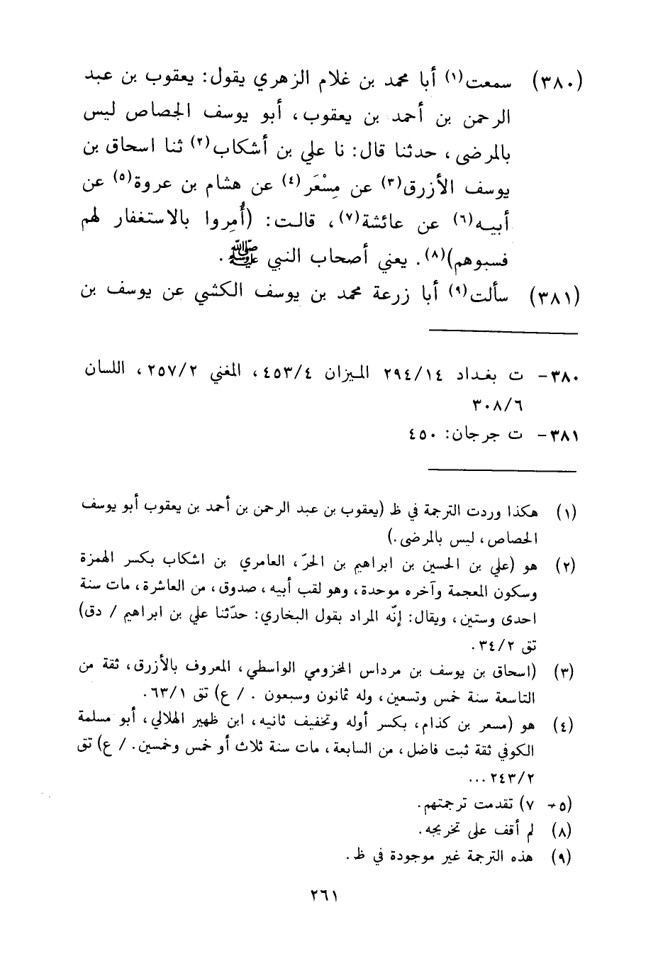 380 - سمعت أبا محمد بن غلام الزهري يقول يعقوب بن عبد الرحمن بن أحمد بن يعقوب أبو يوسف الجصاص ليس بالمرضي حدثنا قال نا علي بن أشكاب ثنا إسحاق بن يوسف الأزرق عن مسعر عن هشام بن عروة عن أبيه عن عائشة قالت أمروا بالاستغفار لهم فسبوهم يعني أصحاب النبي صلى الله عليه وسلم