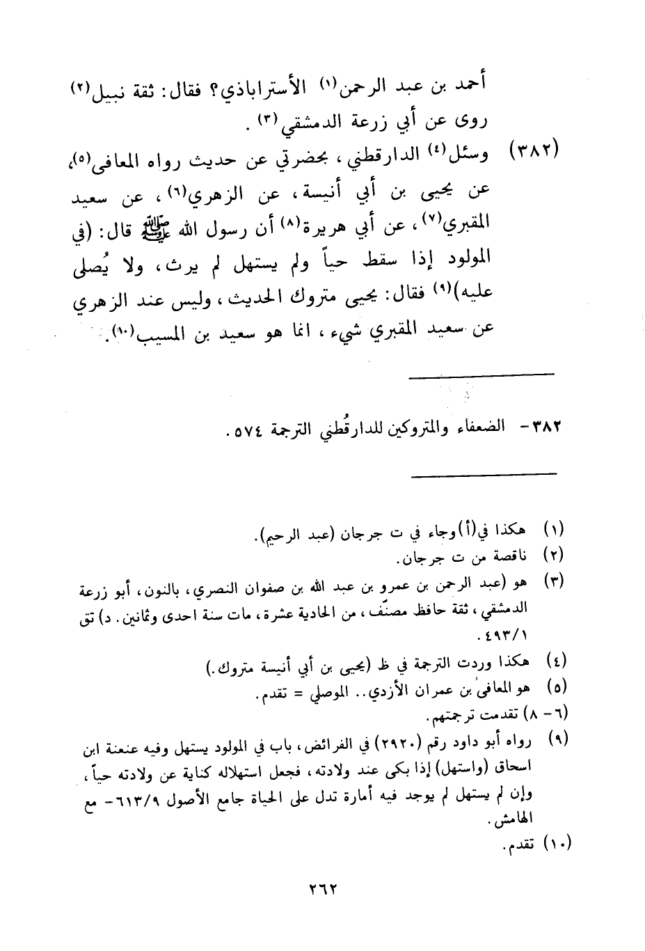 382 - وسئل الدارقطني بحضرتي عن حديث رواه المعافي عن يحيى بن أبي أنيسة عن الزهري عن سعيد المقبري عن أبي هريرة أن رسول الله صلى الله عليه وسلم قال في المولود إذا سقط حيا ولم يستهل لم يرث ولا يصلي عليه فقال يحيى متروك الحديث وليس عند الزهري عن سعيد المقبري شيء إنما هو سعيد بن المسيب