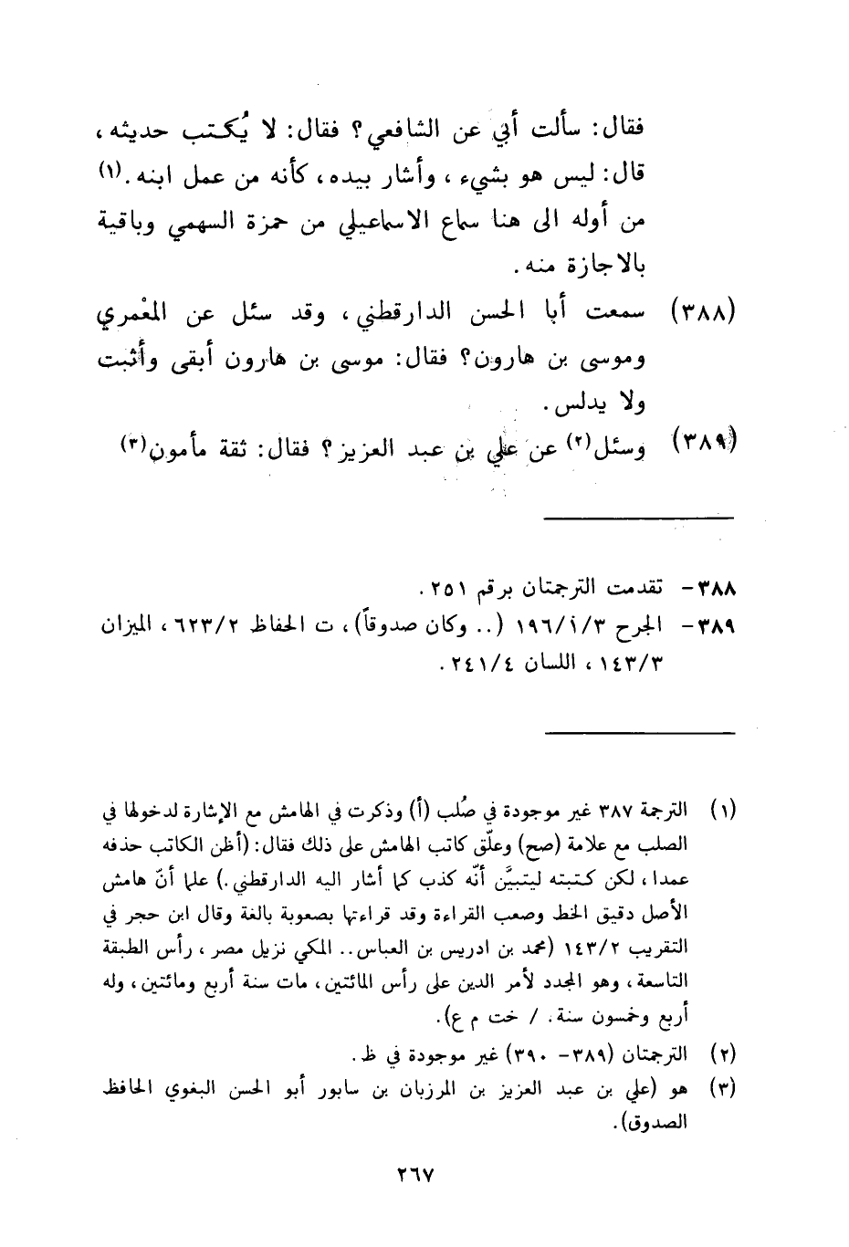 388 - سمعت أبا الحسن الدارقطني وقد سئل عن المعمري وموسى بن هارون فقال موسى بن هارون أبقى وأثبت ولا يدلس