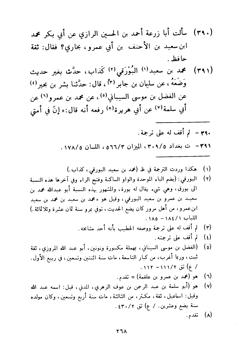 391 - محمد بن سعيد البورقي كذاب حدث بغير حديث وضعه عن سليمان بن جابر قال حدثنا بشر بن بحير عن الفضل بن مسوى السيباني عن محمد بن عمرو عن أبي سلمة عن أبي هريرة رفعه أنه قال إن في أمتي رجلا اسمه النعمان وكنيته أبو حنيفة هو سراج أمتي ثلاثا وحدثنا به أبو زيد بن عامر بالكوفة نا محمد بن سعيد البورقي بغير حديث كلها موضوعات