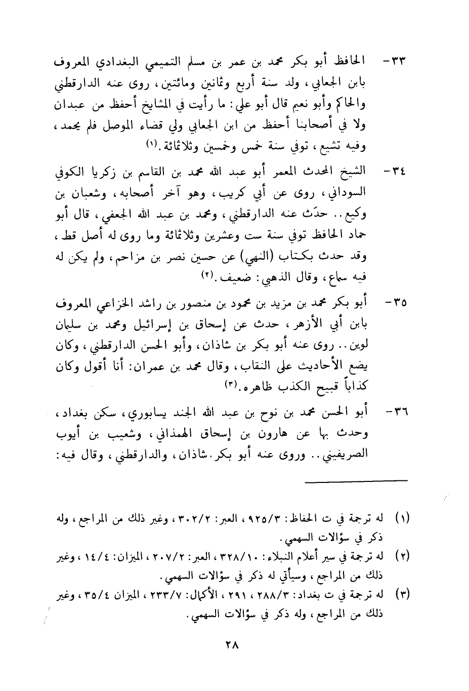 33 - الحافظ أبو بكر محمد بن عمر بن مسلم التميمي البغدادي المعروف بابن الجعابي، ولد سنة اربع وثمانين ومائتين، روى عنه الدارقطني والحاكم وابو نعيم قال أبو علي: ما رايت في المشايخ احفظ من عبدان ولا في اصحابنا احفط من ابن الجعابي ولي قضاء الموصل فلم يحمد، وفيه تشيع، توفي سنة خمس وخمسين وثلاثمائة.