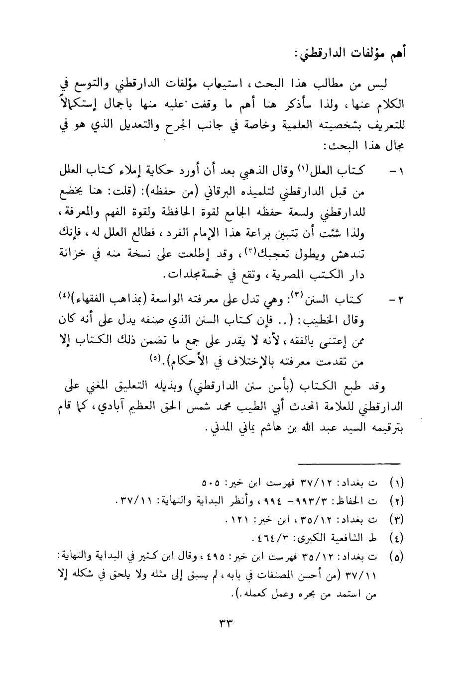 اهم مؤلفات الدارقطني: ليس من مطالب هذا البحث، استيعاب مؤلفات الدارقطني والتوسع في الكلام عنها، ولذا سأذكر هنا اهم ما وقفت عليه منها باجمال استكمالا للتعريف بشخصيته العلمية وخاصة في جانب الجرح والتعديل الذي هو في مجال هذا البحث: 1 - كتاب العلل وقال الذهبي بعد ان اورد حكاية املاء كتاب العلل من قبل الدارقطني لتلميذه البرقاني (من حفظه) : (قلت: هنا يخضع للدارقطني ولسعة حفظه الجامع لقوة الحافظة ولقوة الفهم والمعرفة، ولذا شئت ان تتبين براعة هذا الامام الفرد، فطالع العلل له، فانك تندهش ويطول تعجبك، وقد اطلعت على نسخة منه في خزانة دار الكتب المصرية، وتقع في خمسة مجلدات.