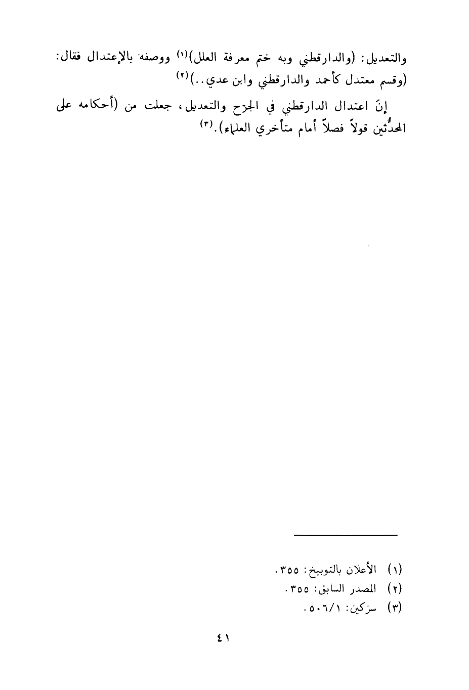 والتعديل: (والدارقطني وبه ختم معرفة العلل) ووصفه بالاعتدال فقال: (وقسم معتدل كاحمد والدارقطني وابن عدي..) ان اعتدال الدارقطني في الجرح والتعديل، جعلت من (احكامه على المحدثين قولا فصلا امام متاخري العلماء) .