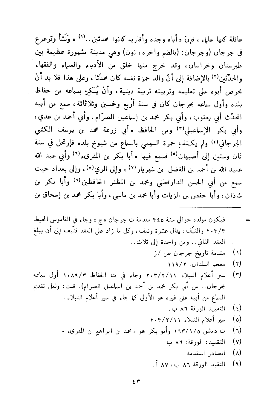 عائلة كلها علماء فان (اباه وجده واقاربه كانوا محدثين..) ونشا وترعرع في جرجان (وجرجان: (بالضم وآخره، نون) وهي مدينة مشهورة عظيمة بين طبرستان وخراسان، وقد خرج منها خلق من الادباء والعلماء والفقهاء والحدثين بالاضافة الى ان والد حمزة نفسه كان محدثا، وعلى هذا فلا بد ان يحرص ابوه على تعليمه وتربيته تربية دينية، وان يبكر بسماعه من حفاظ بلده واول سماعه بجرجان كان في سنة اربع وخمسين وثلاثمائة، سمع من ابيه المحدث ابي يعقوب، وابي بكر محمد بن اسماعيل الصرام، وابي احمد بن عدي، وابي بكر الاسماعيلي ومن الحافظ (ابي زرعة محمد بن يوسف الكشي الجرجاني ولم يكتف حمزة السهمي بالسماع من شيوخ بلده فارتحل في سنة ثمان وستين الى اصبهان فسمع فيها (ابا بكر بن المقرئ وابي عبد الله عبيد الله بن احمد بن الفضل بن شهريار) والى الري، والى بغداد حيث سمع من ابي الحسن الدارقطني ومحمد بن المظفر الحافظين وابا بكر بن شاذان، وابا حفص بن الزيات وابا محمد بن ماسى، وابا بكر محمد بن اسحاق بن