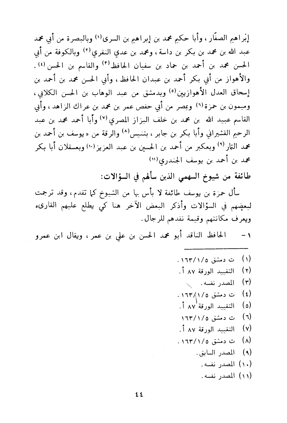 والاهواز من ابي بكر احمد بن عبدان الحافظ، وابي الحسن الكلابي، وميمون بن حمزة وبمصر من ابي حفص عمر بن محمد بن عراك الزاهد، وابي القاسم عبيد الله بن محمد بن خلف البزاز المصري وابا احمد محمد بن عبد الرحيم القشيراني وابا بكر بن جابر بتنيس والرقة من (يوسف بن احمد بن محمد التمار وبعكبر من احمد بن الحسين بن عبد العزيز وبعسقلان ابا بكر محمد بن احمد بن يوسف الجندري طائفة من شيوخ السهمي الذين سالهم في السؤالات: سال حمزة بن يوسف طائفة لا باس بها من الشيوخ كما تقدم، وقد ترجمت لبعضهم في السؤالات واذكر البعض الاخر هنا كي يطلع عليهم القارئ ويعرف مكانتهم وقيمة نقدهم للرجال.