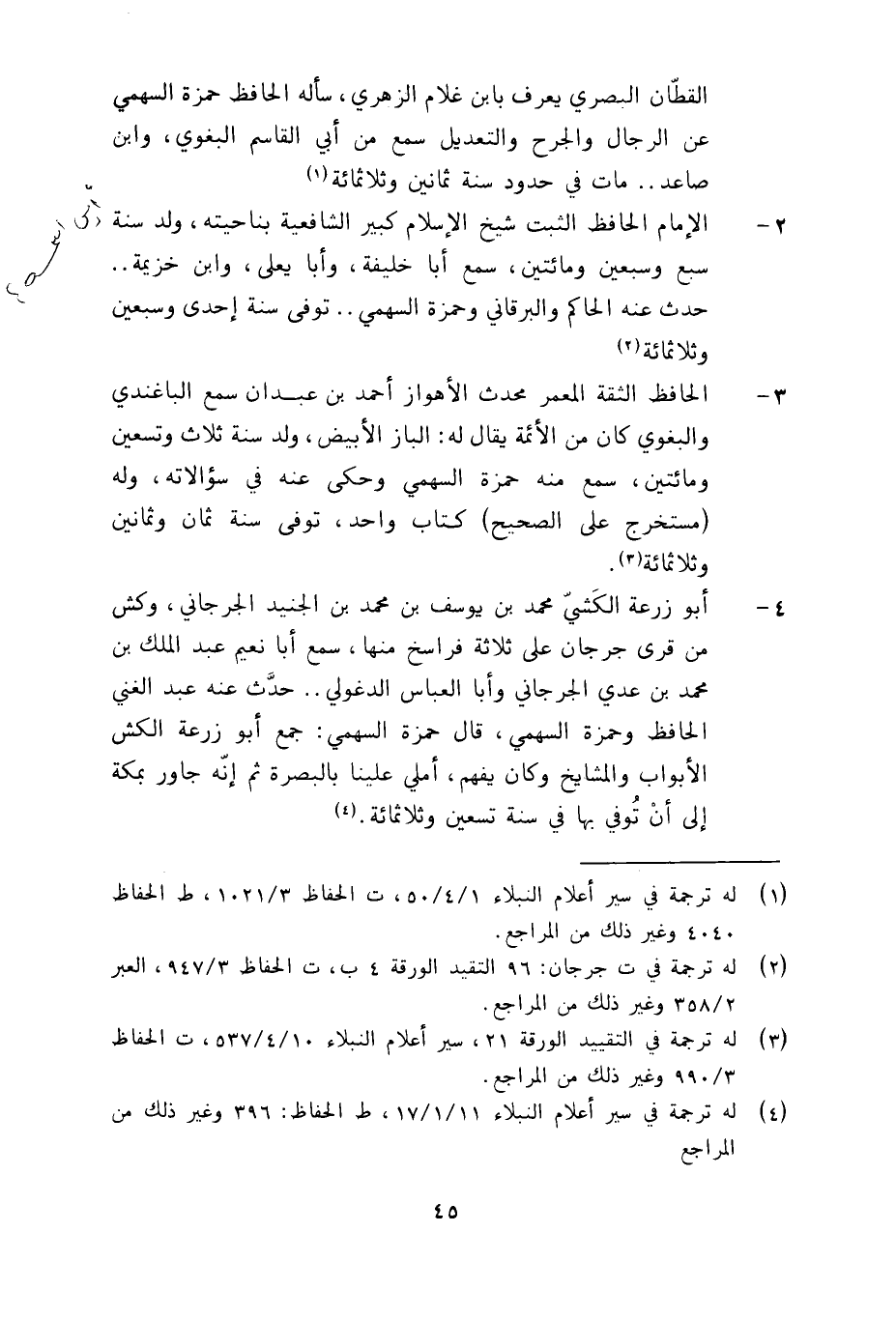 4 - أبو زرعة الكشي محمد بن يوسف بن محمد بن الحنيد الجرجاني، وكش من قرى جرجان على ثلاثة فراسخ منها، سمع ابا يعيم عبد الملك بن محمد بن عدي الجرجاني وابا العباس الدغولي..حدث عنه عبد الغني الحافظ وحمزة السهمي، قال حمزة السهمي: جمع أبو زرعة الكش الابواب والمشايخ وكان يفهم، املي علينا بالبصرة ثم انه جاور بمكة الى ان توفي بها في سنة تسعين وثلاثمائة.