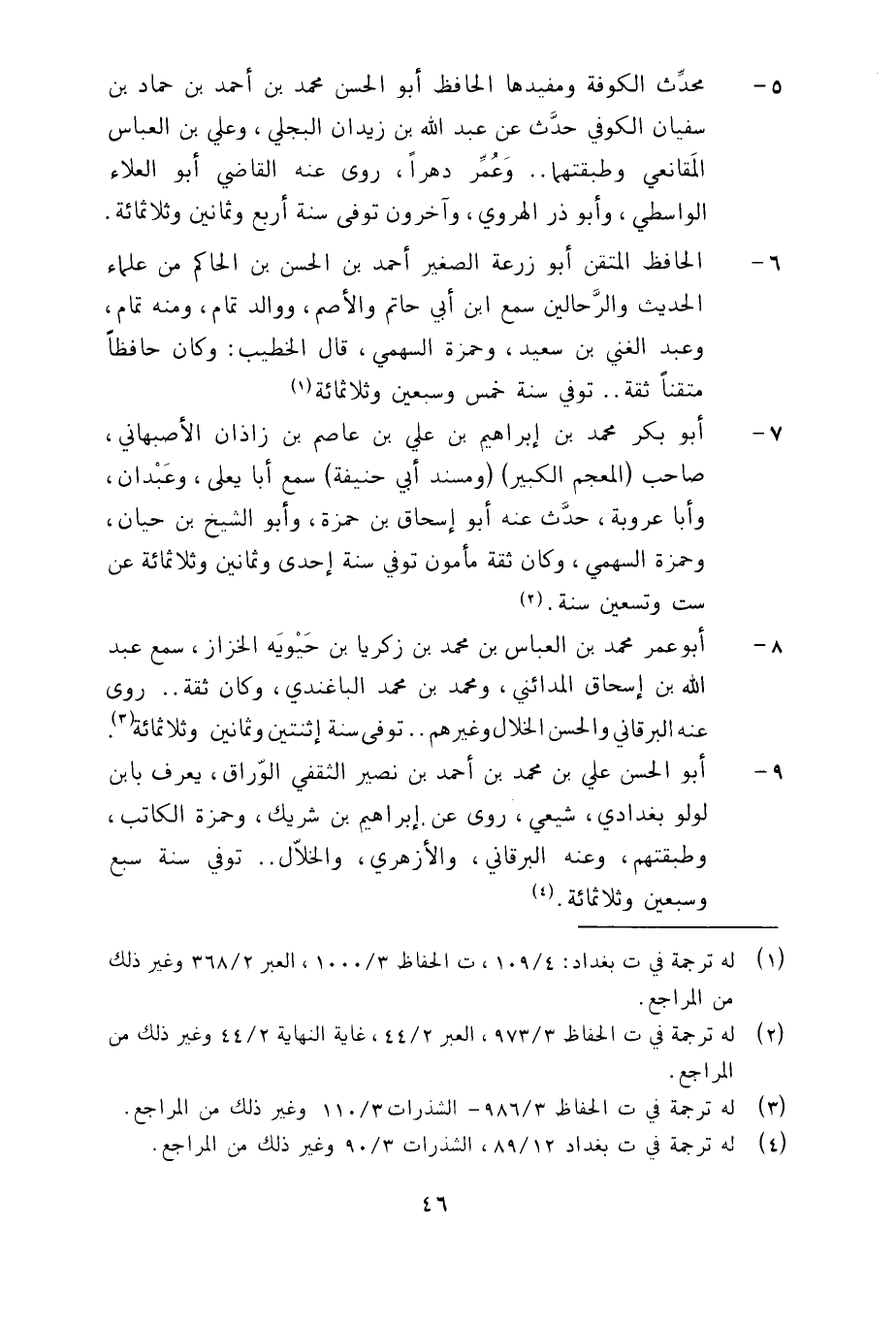 5 - محدث الكوفة ومفيدها الحافظ أبو الحسن محمد بن احمد بن حماد بن سفيان الكوفي حدث عن عبد الله بن زيدان البجلي، وعلي بن العباس المقانعي وطبقتهما..وعمر دهرا، روى عنه القاضي أبو العلاء الواسطي، وابوذر الهروي، وآخرون توفى سنة اربع وثمانين وثلاثمائة.