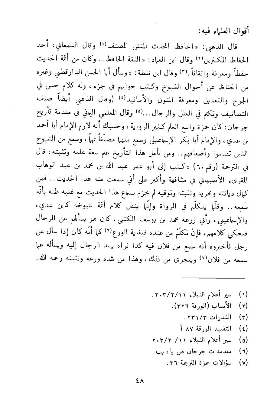 في الترجمة (رقم 60) (كتب الى أبو عمر عبد الله بن محمد بن عبد الوهاب المقرئ الاصبهاني في مشافهة واكبر على اني سمعت منه هذا الحديث..فمن كمال ديانته وتحريه وتثبته وتوقيه لم يجزم بسماع هذا الحديث مع غلبه ظيه بانه سمعه..وقلما يتكلم في الرواة وانما ينقل كلام ائمة شيوخه كابن عدي، والاسماعيلي، وابي زرعة محمد بن يوسف الكشى، كان هو يسالهم عن الرجال فيحكي كلامهم، فان تكلم من عنده فبغاية الورع كما انه كان إذا سال عن رجل فاخبروه انه سمع من فلان فيه كذا نراه يشد الرجال إليه ويساله عما سمعه من فلان ويتحرى من ذلك، وهذا من شدة ورعه وتثبته رحمه الله.