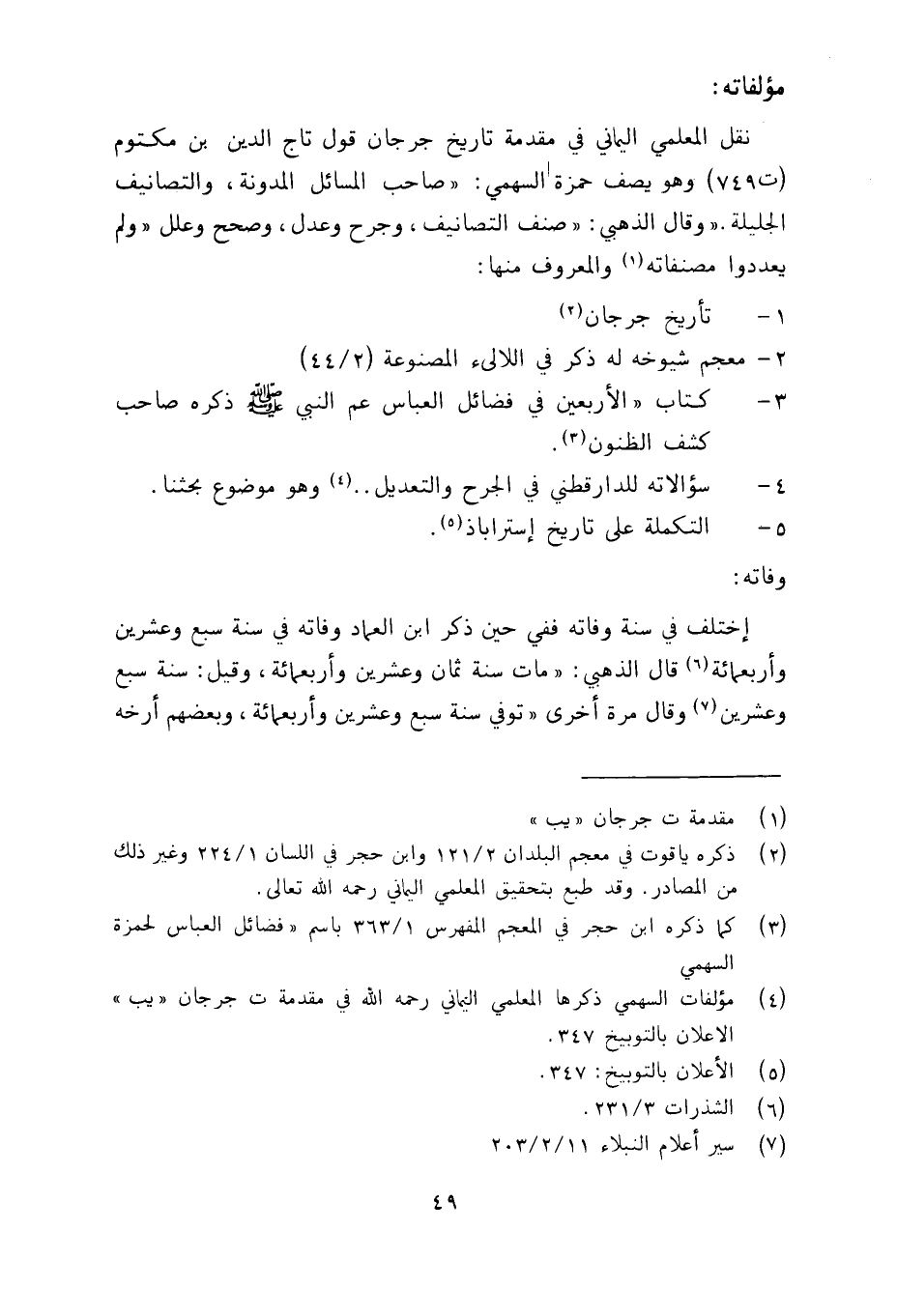 مؤلفاته: نقل المعلمي اليماني في مقدمة تاريخ جرجان قول تاج الدين بن مكتوم (ت 749) وهو يصف حمزة السهمي: (صاحب المسائل المدونة، والتصانيف الجليلة.