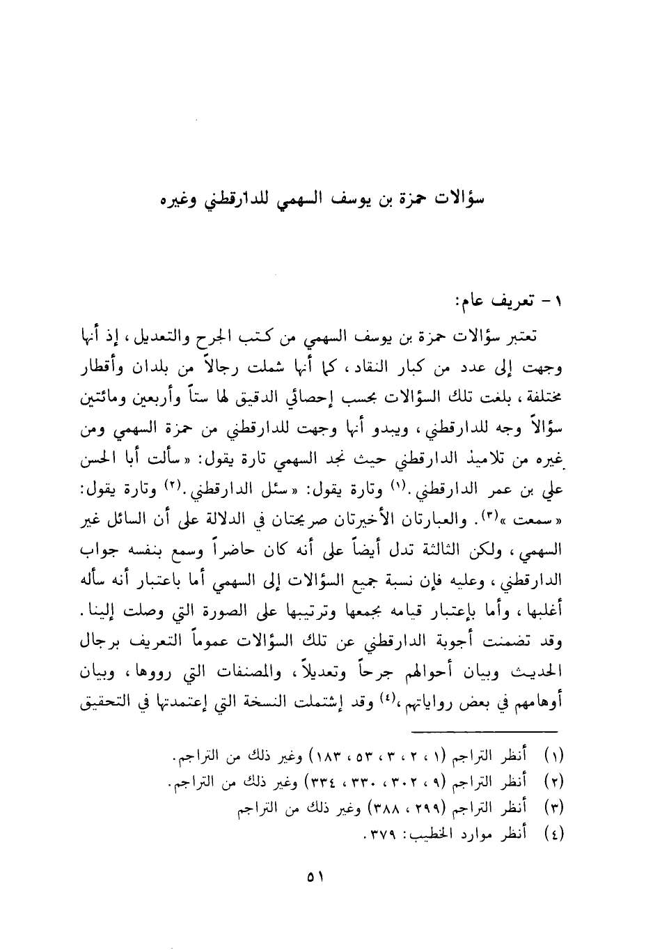 1 - تعريف عام: تعتبر سؤالات حمزة بن يوسف السهمي من كتب الجرح والتعديل، إذ انها وجهت الى عدد من كبار النقاد، كما انها شملت رجالا من بلدان واقطار مختلفة، بلغت تلك السؤالات بحسب احصائي الدقيق لها ستا واربعين ومائتين سؤالا وجه للدارقطني، ويبدو انها وجهت للدارقطني من حمزة السهمي ومن غيره من تلاميذ الدارقطني، ويبدو انها وجهت للدارقطني من حمزة السهمي ومن غيره من تلاميذ الدارقطني حيث نجد السهمي تارة يقول: (سالت ابا الحسن علي بن عمر الدارقطني.
