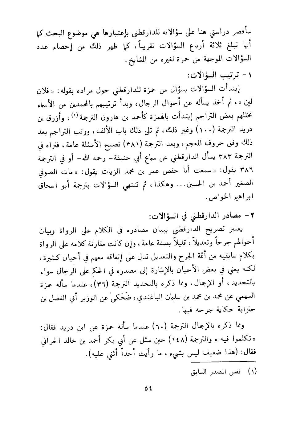 ساقصر دراستي هنا على سؤالاته للدارقطني باعتبارها هي موضوع البحث كما انها تبلغ ثلاثة ارباع السؤالات تقريبا، كما ظهر ذلك من احصاء عدد السؤالات الموجهة من حمزة لغيره من المشايخ.