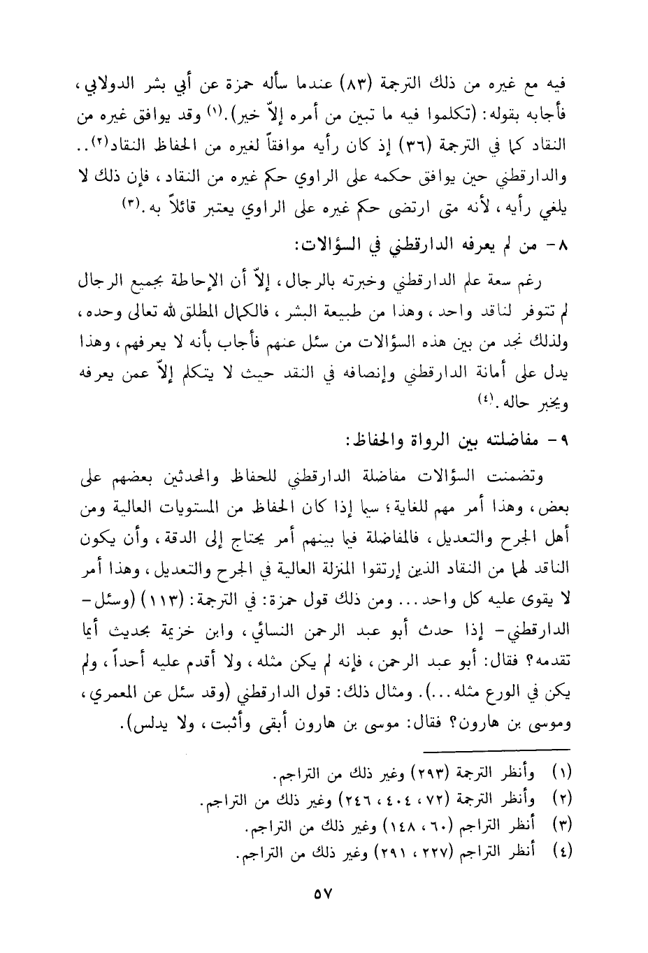 9 - مفاضلته بين الرواة والحفاظ: وتضمنت السؤالات مفاضلة الدارقطني للحفاظ والمحدثين بعضهم على بعض وهذا امر مهم للغاية، سيما إذا كان الحفاظ من المستويات العالية ومن اهل الجرح والتعديل، فالمفاضلة فيما بينهم امر يحتاج الى الدقة، وان يكون الناقد لهما من النقاد الذين ارتقوا المنزلة العالية في الجرح والتعديل، وهذا امر لا يقوى عليه كل واحد ... ومن ذلك قول حمزة: في الترجمة: (113) (وسئل - الدارقطني - إذا حدث أبو عبد الرحمن النسائي، وابن خزيمة بحديث ايما تقدمه؟ فقال: أبو عبد الرحمن، فانه لم يكن مثله، ولا اقدم عليه احدا، ولم يكن في الورع مثله) .
