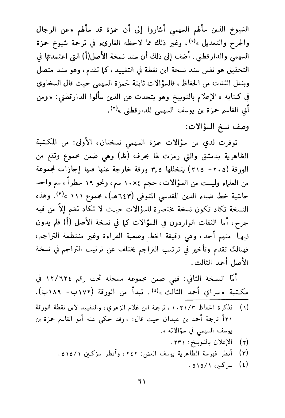 وصف نسخ السؤالات: توفرت لدي من سؤالات حمزة السهمي نسختان، الاولى: من المكتبة الظاهرية بدمشق والتي رمزت لها بحرف (ظ) وهي ضمن مجموع وتقع من الورقة (205 - 215) يتخللها 5، 3 ورقة خارجة عنها فيها اجازات لمجموعة من العلماء وليست من السؤالات، حجم 4 10 سم، ونحو 19 سطرا، سم واحد حاشية خط ضياء الدين المقدسي المتوفى (643 هـ) ، مجموع 111) .