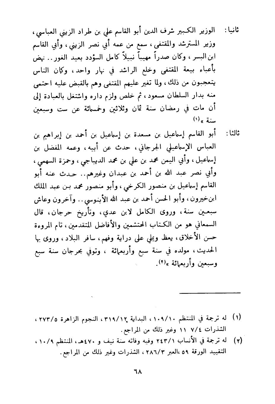 ثانيا: الوزير الكبير شرف الدين أبو القاسم علي بن طراد الزيني العباسي، وزير المسترشد والمقتفى، سمع من عمه ابي نصر الزيني، وابي القاسم ابن البسر، وكان صدرا مهيبا نبيلا كامل السؤدد بعيد الغور..نهض باعباء بيعة المقتفى وخلع الراشد في نهار واحد، وكان الناس يتعجبون من ذلك، ولما تغير عليهم المقتفى وهم بالقبض عليه احتمى منه بدار السلطان مسعود، ثم خلص ولزم داره واشتغل بالعبادة الى ان مات في رمضان سنة ثمان وثلاثين وخمسمائة عن ست وسبعين سنة) .