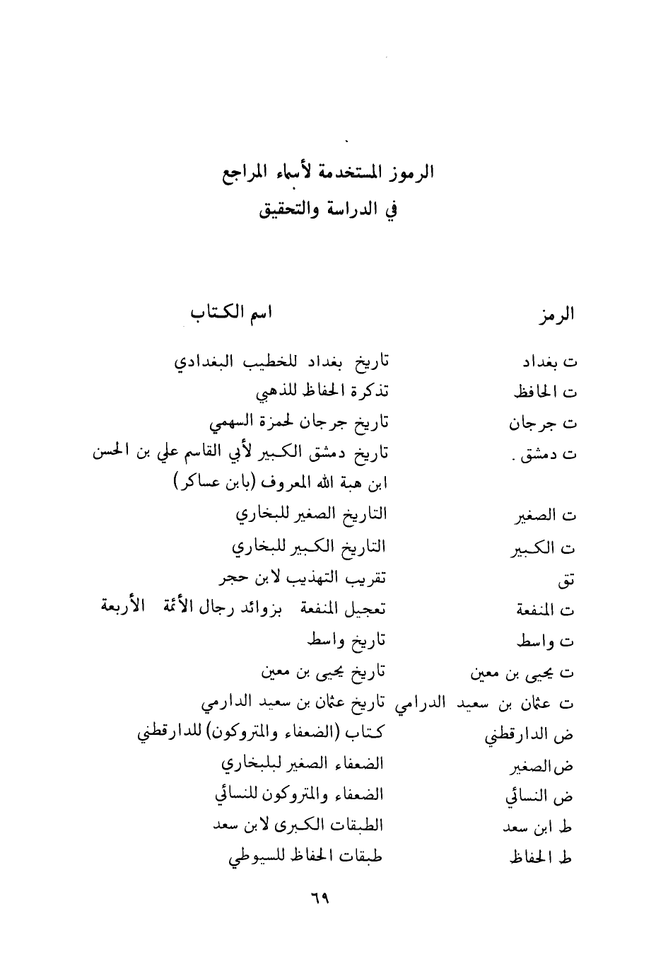 الرموز المستخدمة لاسماء المراجع في الدارسة والتحقيق الرمز اسم الكتاب ت بغداد تاريخ بغداد للخطيب البغدادي ت الحافظ تذكرة الحفاظ للذهبي ت جرجان تاريخ جرجان لحمزة السهمي ت دمشق تاريخ دمشق الكبير لابي القاسم علي بن الحسن ابن هبة الله المعروف (بابن عساكر) ت الصغير التاريخ الصغير للبخاري ت الكبير التاريخ الكبير للبخاري تق تقريب التهذيب لابن حجر ت المنفعة تعجيل المنفعة بزوائد رجال الائمة الاربعة ت واسط تاريخ واسط