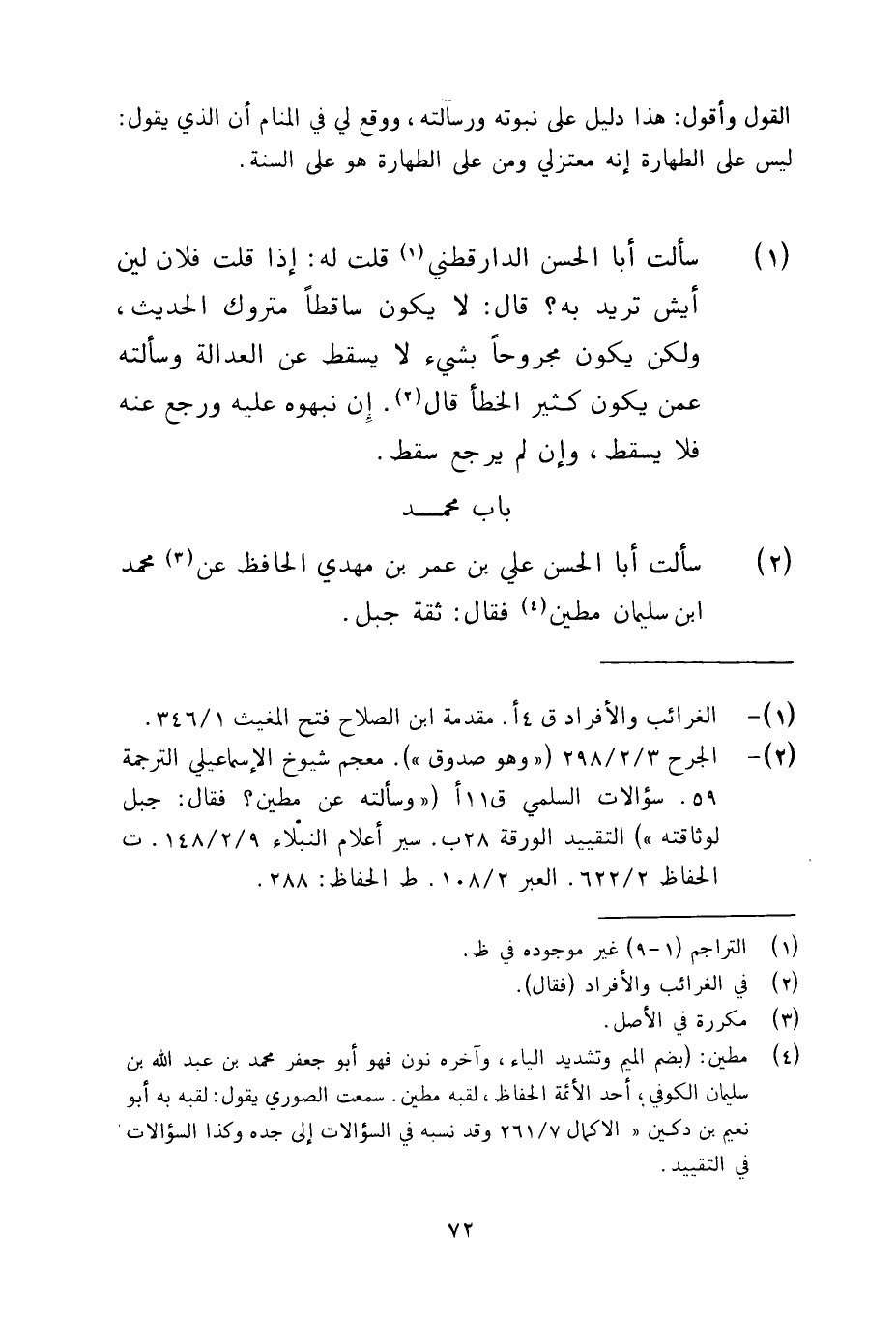 1 - سألت أبا الحسن الدارقطني قلت له إذا قلت فلان لين أيش تريد به قال لا يكون ساقطا متروك الحديث ولكن يكون مجروحا بشيء لا يسقط عن العدالة وسألته عمن يكون كثير الخطأ قال إن نبهوه عليه ورجع عنه فلا يسقط وإن لم يرجع سقط