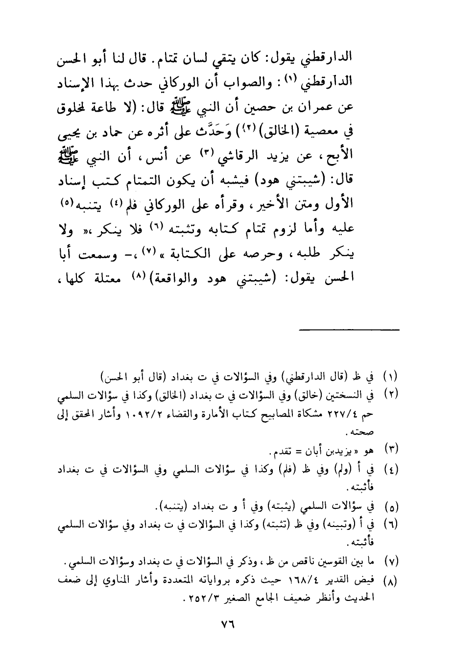 الدارقطني يقول كان يتقي لسان تمتام قال لنا أبو الحسن الدارقطني والصواب أن الوركاني حدث بهذا الإسناد عن عمران بن حصين أن النبي صلى الله عليه وسلم قال لا طاعة لمخلوق في معصية الخالق وحدث على أثره عن حماد بن يحيى الأبح عن يزيد الرقاشي عن أنس أن النبي صلى الله عليه وسلم قال شيبتني هود فيشبه أن يكون التمتام كتب إسناد الأول ومتن الأخير وقرأه على الوركاني فلم يتنبه عليه وأما لزوم تمتام كتابه وتثبته فلا ينكر ولا ينكر طلبه وحرصه على الكتابة وسمعت أبا الحسن يقول شيبتني هود والواقعة معتلة كلها