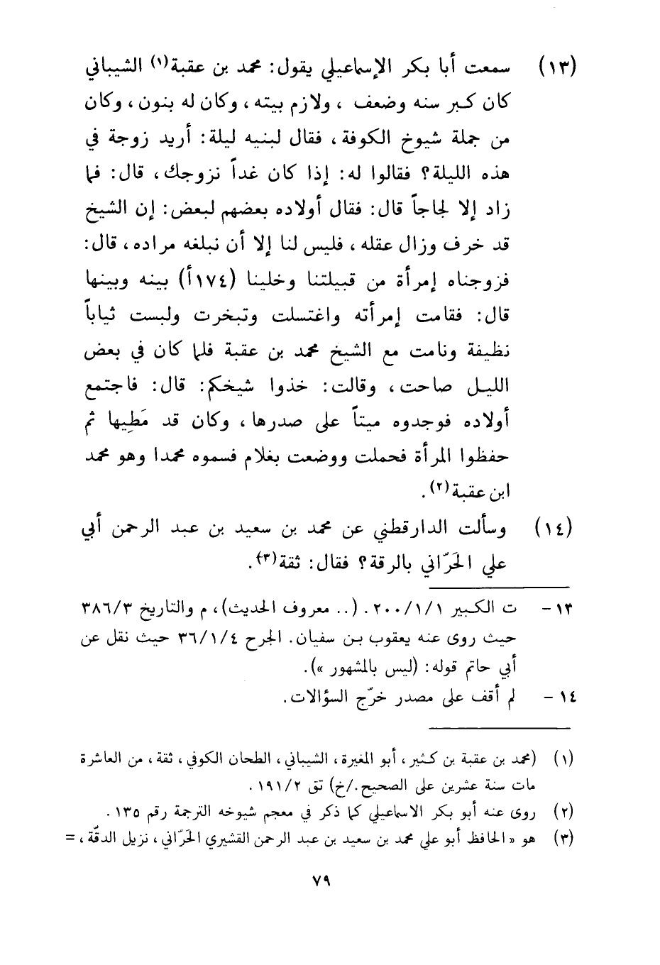 13 - سمعت أبا بكر الإسماعيلي يقول محمد بن عقبة الشيباني كان كبر سنه وضعف ولازم بيته وكان له بنون وكان من جملة شيوخ الكوفة فقال لبنيه ليلة أريد زوجة في هذه الليلة فقالوا له إذا كان غدا نزوجك قال فما زاد إلا لجاجا قال فقال أولاده بعضهم لبعض إن الشيخ قد خرف وزال عقله فليس لنا إلا أن نبلغه مراده قال فزوجناه امرأة من قبيلتنا وخلينا بينه وبينها قال فقامت امرأته واغتسلت وتبخرت ولبست ثيابا نظيفة ونامت مع الشيخ محمد بن عقبة فلما كان في بعض الليل صاحت وقالت خذوا شيخكم قال فاجتمع أولاده فوجدوه ميتا على صدرها وكان قد مطيها ثم حفظوا المرأة فحملت ووضعت بغلام فسموه محمدا وهو محمد بن عقبة