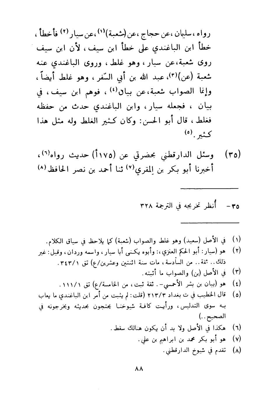 35 - وسئل الدارقطني بحضرتي عن حديث رواه أخبرنا أبو بكر بن المقري ثنا أحمد بن نصر الحافظ ثنا جعفر الطيالسي قال قلت ليحيى بن معين عمن أكتب بالبصرة قال اكتب عن مسدد فإنه ثقة ولا تكتب عن المقدمي الكبير يريد عبد الله بن أبي بكر فإنه كذاب