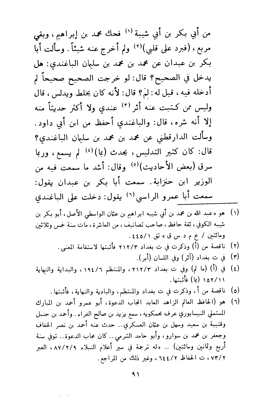 من أبي بكر بن أبي شيبة فحك محمد بن إبراهيم وبقي مربع فبرد على قلبي ولم أخرج عنه شيئا وسألت أبا بكر بن عبدان عن محمد بن محمد بن سليمان الباغندي هل يدخل في الصحيح قال لو خرجت الصحيح صحيحا لم أدخله فيه قيل له لم قال لأنه كان يخلط ويدلس قال وليس ممن كتبت عنه أثر عندي ولا أكثر حديثا منه إلا أنه شره قال والباغندي أحفظ من بن أبي داود وسألت الدارقطني عن محمد بن محمد بن سليمان الباغندي قال كان كثير التدليس يحدث بما لم يسمع وربما سرق بعض الأحاديث وقال أشد ما سمعت فيه من الوزير بن حنزابة سمعت أبا بكر بن عبدان يقول سمعت أبا عمرو الراسبي يقول دخلت على الباغندي