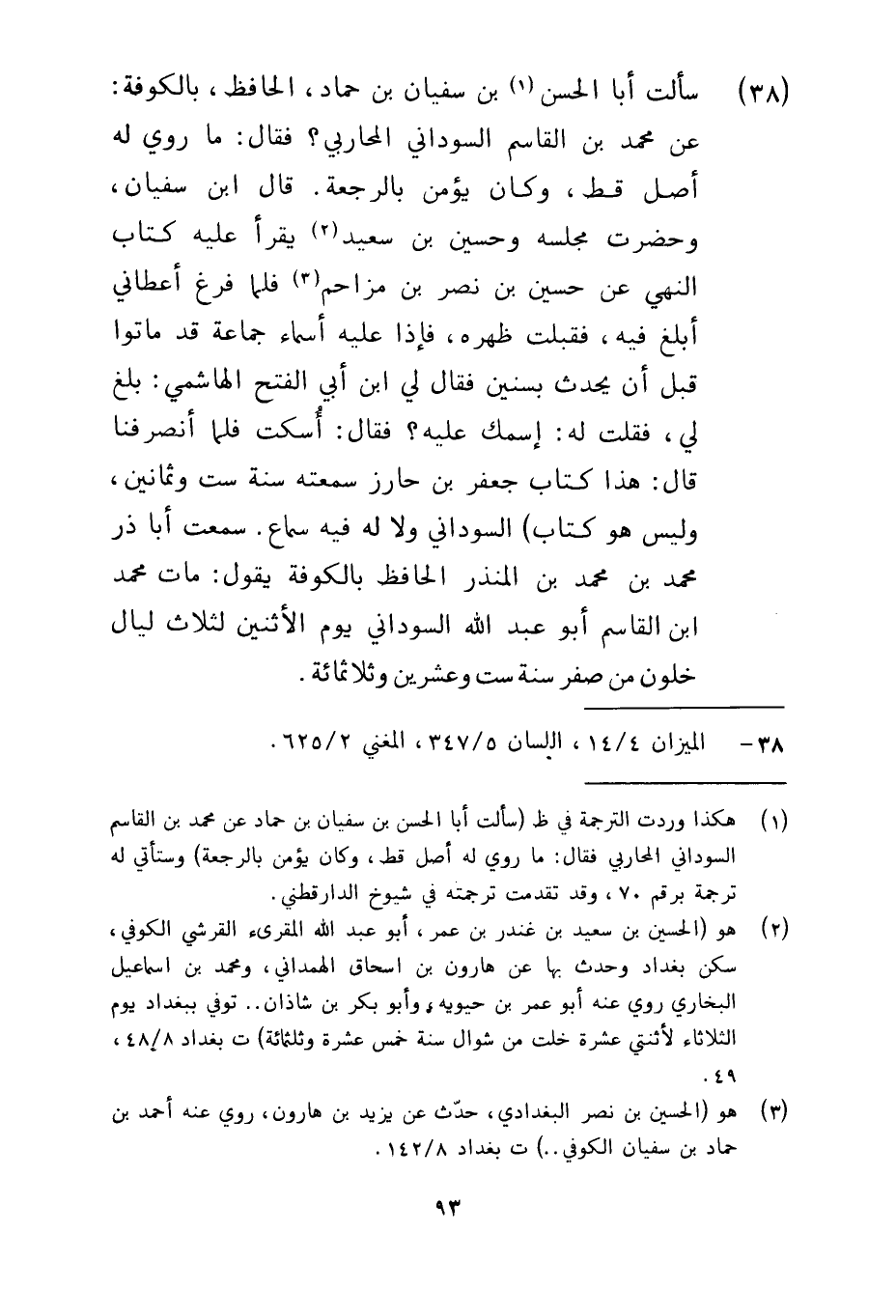 38 - سألت أبا الحسن بن سفيان بن حماد الحافظ بالكوفة عن محمد بن القاسم السوداني المحاربي فقال ما روى له أصل قط وكان يومن بالرجعة قال بن سفيان وحضرت مجلس وحسين بن سعيد يقرأ عليه كتاب النهي عن حسن بن نصر بن مزاحم فلما فرغ أعطاني أبلغ فيه فقبلت ظهره فإذا عليه أسماء جماعة قد ماتوا قبل أن يحدث بسنين فقال لي بن أبي الفتح الهاشمي بلغ لي فقلت له اسمك عليه فقال أسكت فلما أنصرفنا قال هذا كتاب جعفر بن حارز سمعته سنة ست وثمانين وليس هو كتاب السوداني ولا له فيه سماع سمعت أبا ذر محمد بن محمد بن المنذر الحافظ بالكوفة يقول مات محمد بن القاسم أبو عبد الله السوداني يوم الإثنين لثلاث ليال خلون من صفر سنة ست وعشرين وثلاثمائة