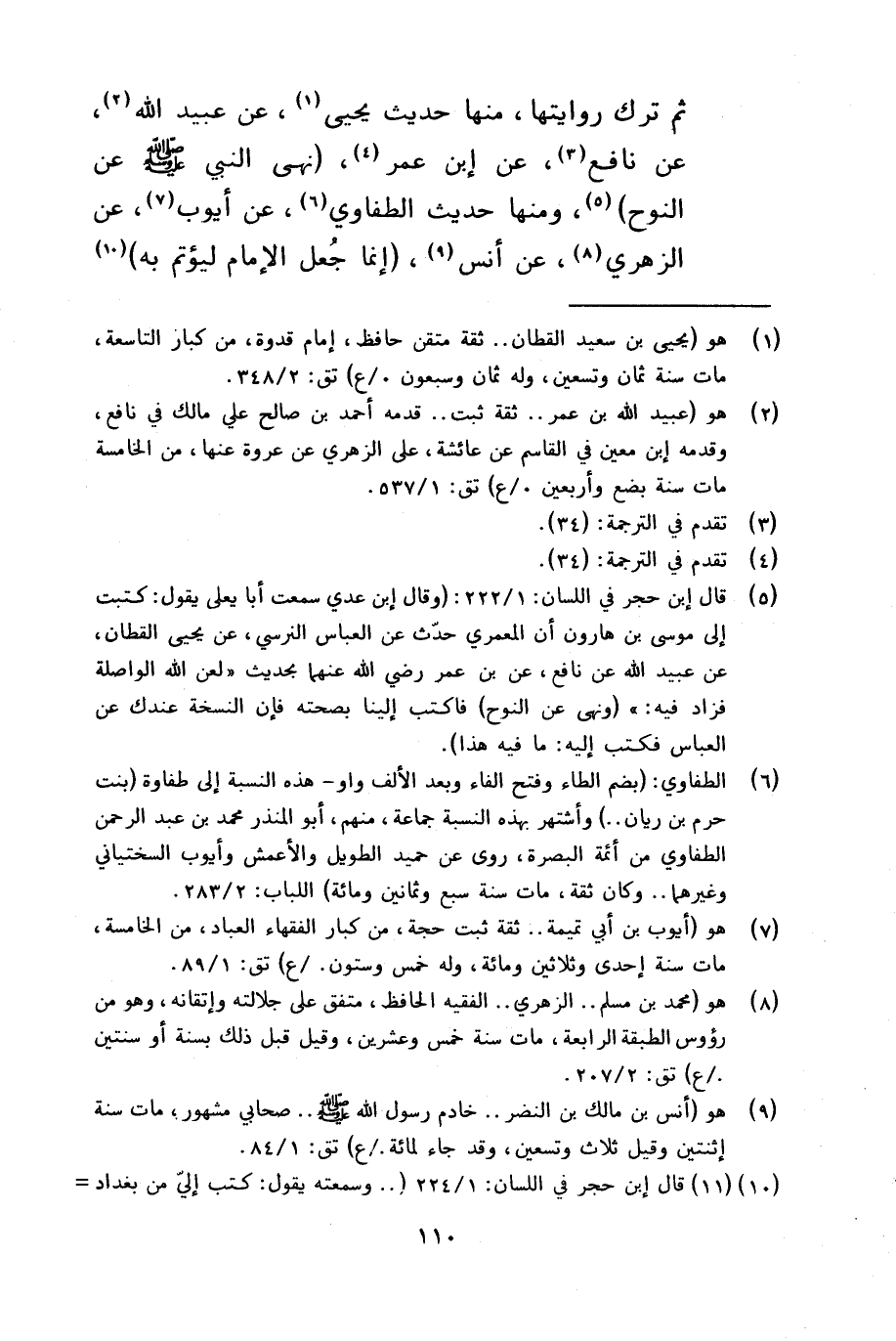 ثمَّ ترك رِوَايَتهَا مِنْهَا حَدِيث يحيى عَن عبيد الله عَن نَافِع عَن بن عمر نهى النَّبِي صلى الله عَلَيْهِ وَسلم عَن النوح وَمِنْهَا حَدِيث الطفَاوِي عَن أَيُّوب عَن الزُّهْرِيّ عَن أنس إِنَّمَا جعل الإِمَام ليؤتم بِهِ وَفِيه إِذا قَرَأَ فأنصتوا كَذَا وَقع فِي أَصله فَلَمَّا أنكر عَلَيْهِ تَركه