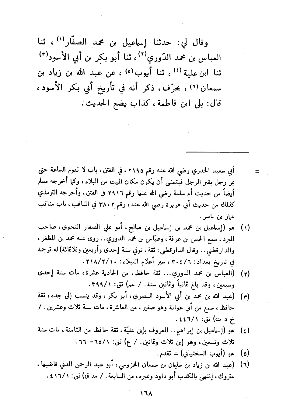 وَقَالَ لي حَدثنَا إِسْمَاعِيل بن مُحَمَّد الصفار ثَنَا الْعَبَّاس بن مُحَمَّد الدوري ثَنَا أَبُو بكر بن أبي الْأسود ثَنَا بن علية ثَنَا أَيُّوب عَن عبد الله بن زِيَاد بن سمْعَان يحرف ذكر أَنه فِي تأريخ أبي بكر الْأسود قَالَ بلَى بن فَاطِمَة كَذَّاب يضع الحَدِيث