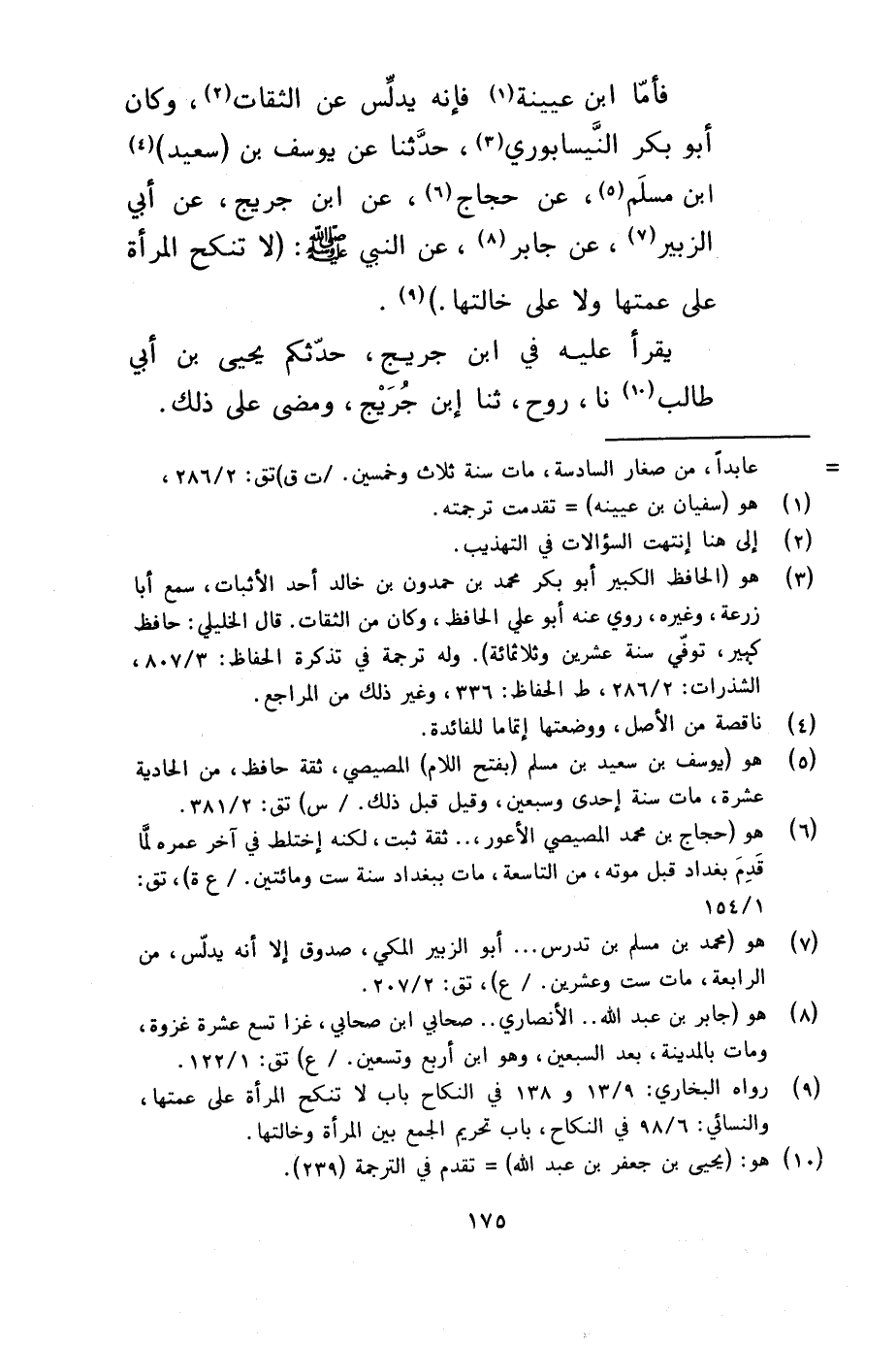 فَأَما بن عُيَيْنَة فَإِنَّهُ يُدَلس عَن الثِّقَات وَكَانَ أَبُو بكر النَّيْسَابُورِي حَدثنَا عَن يُوسُف بن سعيد بن مُسلم عَن حجاج عَن بن جريح عَن أبي الزبير عَن جَابر عَن النَّبِي صلى الله عَلَيْهِ وَسلم لَا تنْكح الْمَرْأَة على عَمَّتهَا وَلَا على خَالَتهَا يقْرَأ عَلَيْهِ فِي بن جريح حَدثكُمْ يحيى بن أبي طَالب نَا روح ثَنَا بن جريح وَمضى على ذَلِك