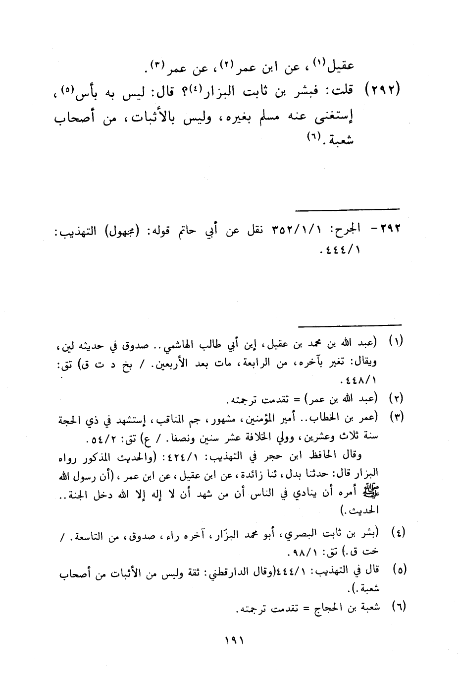 292 - قلت فبشر بن ثَابت الْبَزَّار قَالَ لَيْسَ بِهِ بَأْس إستغنى عَنهُ مُسلم بِغَيْرِهِ وَلَيْسَ بالأثبات من أَصْحَاب شُعْبَة