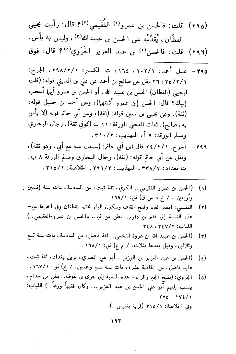 295 - قلت فالحسن بن عَمْرو الْفُقيْمِي قَالَ رَأَيْت يحيى الْقطَّان يقدمهُ على الْحسن بن عبيد الله وَلَيْسَ بِهِ بَأْس