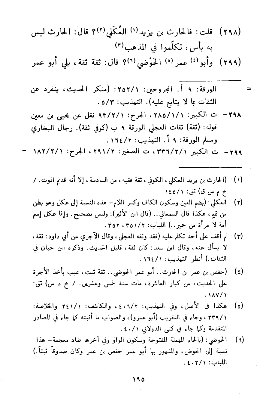 299 - وَأَبُو عمر الحوصي قَالَ ثِقَة ثِقَة يَلِي أَبُو عمر الضَّرِير الَّذِي خرجه عَليّ بن الْمَدِينِيّ كِلَاهُمَا يرويان عَن شُعْبَة وَأَبُو عمر الدوري أَيْضا يُقَال لَهُ الضَّرِير وَهُوَ ضَعِيف وللمصريين شيخ يُقَال لَهُ أَبُو عمر الْمَازِني حَفْص بن عمر يحدث عَن شُعْبَة وَسَعِيد حدث عَنهُ أَبُو قلَابَة وَغير