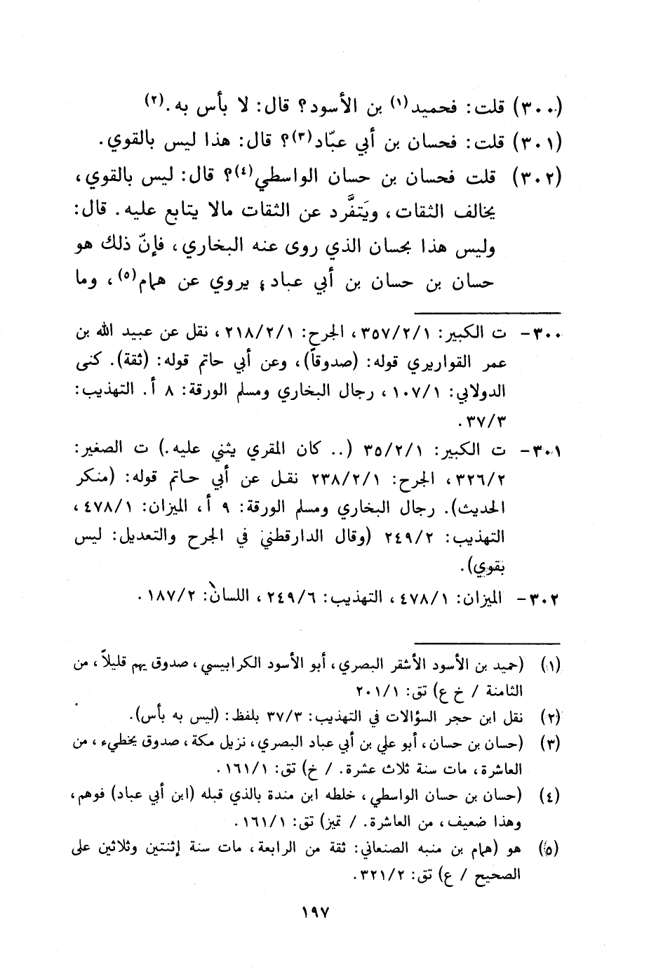 302 - قلت فحسان بن حسان الوَاسِطِيّ قَالَ لَيْسَ بِالْقَوِيّ يُخَالف الثِّقَات ويتفرد عَن الثِّقَات مَالا يُتَابع عَلَيْهِ قَالَ وَلَيْسَ هَذَا بِحسان الَّذِي روى عَنهُ البُخَارِيّ فَإِن ذَلِك هُوَ حسان بن حسان بن أبي عباد يروي عَن همام وَمَا أعرف لَهُ عَن شُعْبَة شَيْئا وَقد روى البُخَارِيّ عَن حسان بن عبد الله الوَاسِطِيّ كَانَ بِمصْر يروي عَن الْمفضل بن فضَالة وَهَؤُلَاء