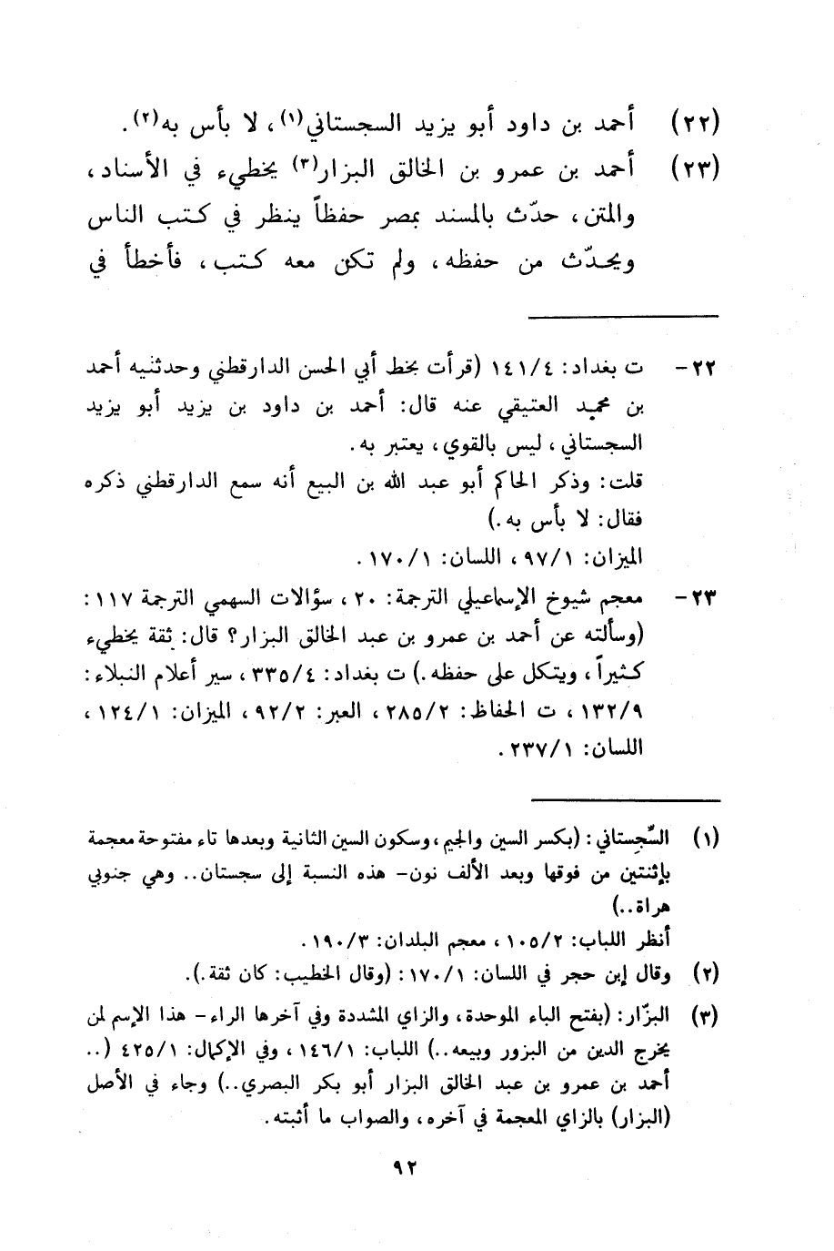 23 - أَحْمد بن عَمْرو بن الْخَالِق الْبَزَّار يخطىء فِي الأسناد والمتن حدث بالمسند بِمصْر حفظا ينظر فِي كتب النَّاس وَيحدث من حفظه وَلم تكن مَعَه كتب فَأَخْطَأَ فِي أَحَادِيث كَثِيرَة يَتَكَلَّمُونَ فِيهِ جرحه أَبُو عبد الرَّحْمَن النَّسَائِيّ