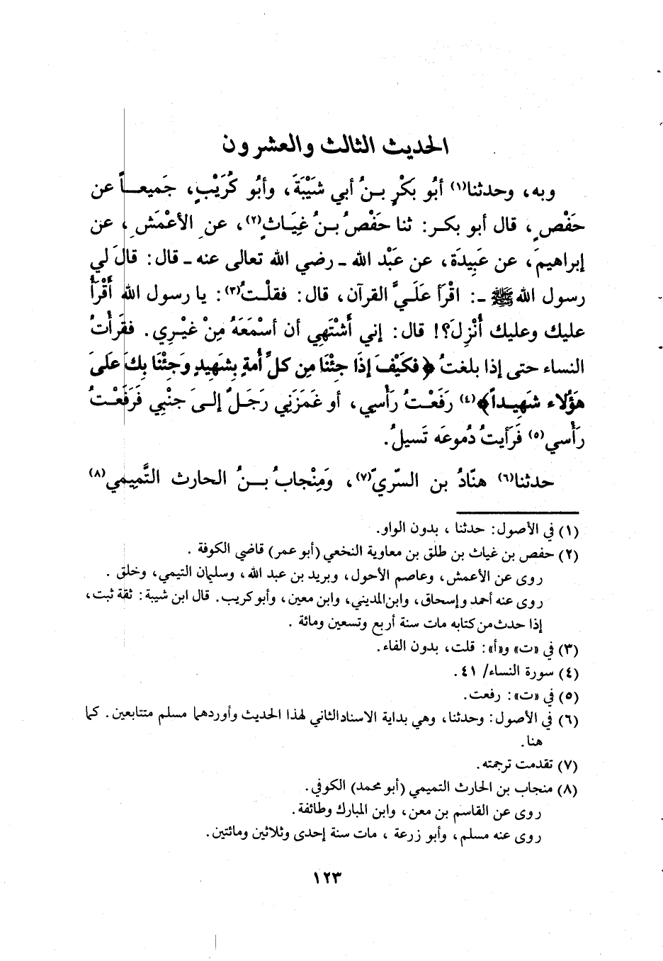 23- وبه، وحدثنا أبو بكرٍ بن أبي شيبة، وأبو كريبٍ، جميعاً عن حفصٍ، قال أبو بكر: ثنا حفص بن غياثٍ، عن الأعمش، عن إبراهيم، عن عبيدة، عن عبد الله -رضي الله تعالى عنه- قال: قال لي رسول الله - صلى الله عليه وسلم -: اقرأ علي القرآن، قال: فقلت: يا رسول الله أقرأ عليك وعليك أنزل؟! قال: إني أشتهي أن أسمعه من غيري. فقرأت النساء حتى إذا بلغت {فكيف إذا جئنا من كل أمةٍ بشهيدٍ وجئنا بك على هؤلاء شهيداً} رفعت رأسي، أو غمزني رجلٌ إلى جنبي فرفعت رأسي فرأيت دموعه تسيل.