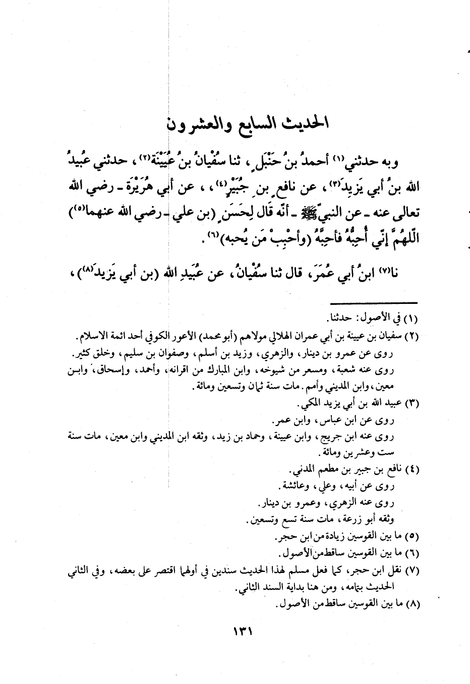 27- وبه حدثني أحمد بن حنبل، ثنا سفيان بن عيينة، حدثني عبيد الله بن أبي يزيد، عن نافع بن جبير، عن أبي هريرة -رضي الله تعالى عنه- عن النبي - صلى الله عليه وسلم - أنه قال لحسنٍ (بن علي -رضي الله عنهما) اللهم إني أحبه فأحبه (وأحبب من يحبه) .
