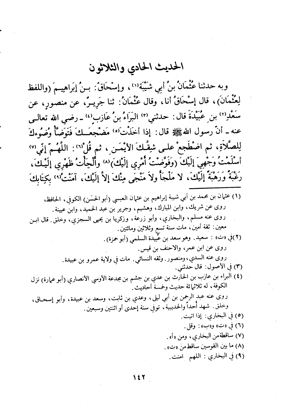 31- وبه حدثنا عثمان بن أبي شيبة، وإسحاق: بن إبراهيم (واللفظ لعثمان) ، قال إسحاق أنا، وقال عثمان: ثنا جريرٌ، عن منصورٍ، عن سعدٍ بن عبيدة قال: حدثني البراء بن عازب -رضي الله تعالى عنه- أن رسول الله صلى الله عليه وسلم قال: إذا أخذت مضجعك فتوضأ وضوءك للصلاة، ثم اضطجع على شقك الأيمن، ثم قل: اللهم إني أسلمت وجهي إليك (وفوضت أمري إليك) وألجأت ظهري إليك، رغبةً ورهبةً إليك، لا ملجأ ولا منجى منك إلا إليك، آمنت بكتابك -[143]- الذي أنزلت، وبنبيك الذي أرسلت (واجعلهن من آخر كلامك) فإن مت من ليلتك مت وأنت على الفطرة، قال: فرددتهن لأستذكرهن، فقلت: آمنت برسولك الذي أرسلت، قال: قل: آمنت بنبيك الذي أرسلت.