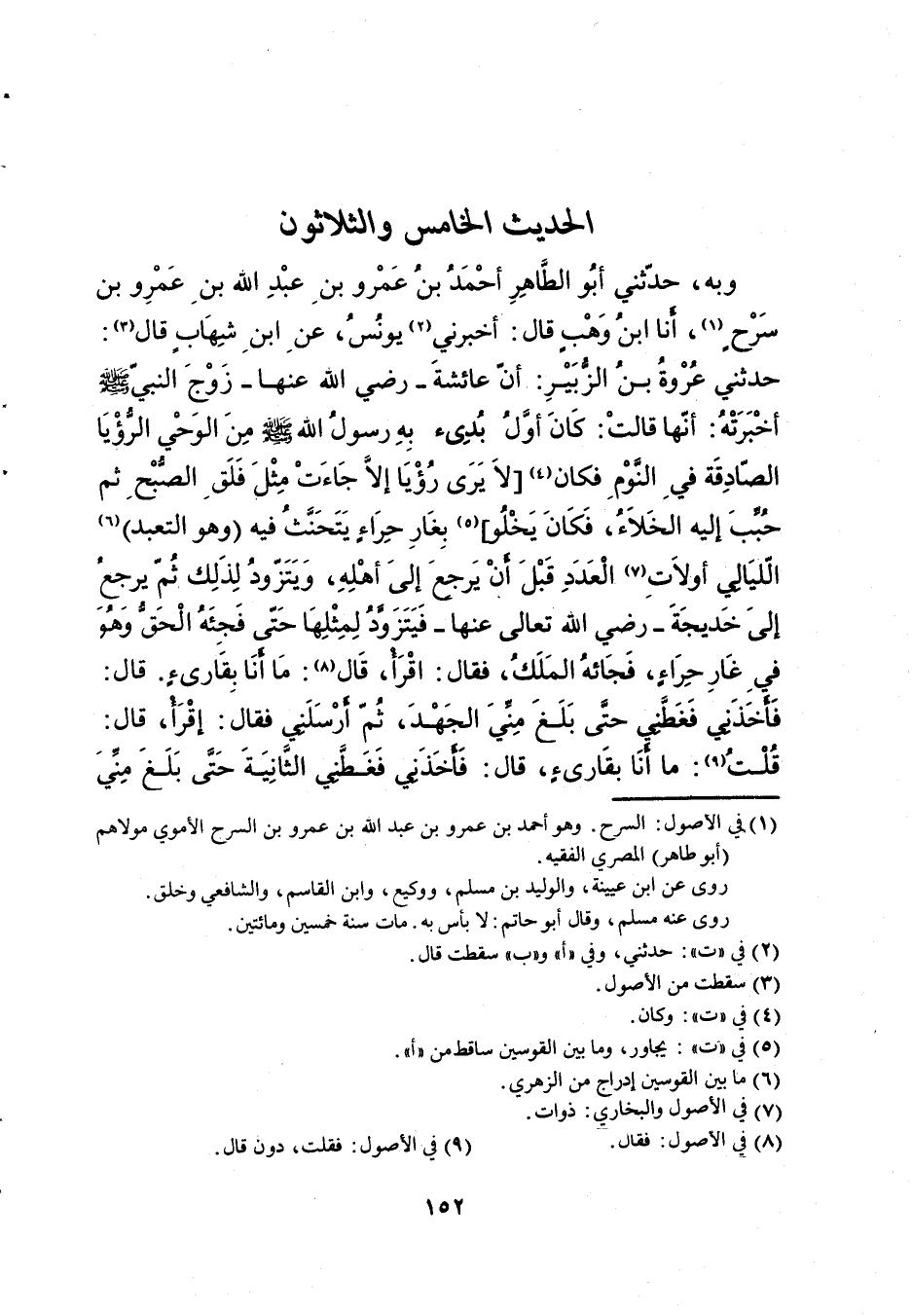 35- وبه، حدثني أبو الطاهر أحمد بن عمرو بن عبيد الله بن عمرو بن سرحٍ، أنا ابن وهبٍ قال: أخبرني يونس، عن ابن شهابٍ قال: حدثني عروة بن الزبير: أن عائشة -رضي الله عنها- زوج النبي صلى الله عليه وسلم أخبرته: أنها قالت: كان أول [ما] (¬1) بدئ به رسول الله صلى الله عليه وسلم من الوحي الرؤيا الصادقة في النوم فكان [لا يرى رؤيا إلا جاءت مثل فلق الصبح ثم حبب إليه الخلاء، فكان يخلو] بغار حراءٍ يتحنث فيه (وهو التعبد) الليالي أولات العدد قبل أن يرجع إلى أهله، ويتزود لذلك ثم يرجع إلى خديجة -رضي الله تعالى عنها- فيتزود لمثلها حتى فجئه الحق وهو في غار حراء، فجاءه الملك، فقال: اقرأ، قال: ما أنا بقارئٍ. قال: فأخذني فغطني حتى بلغ مني الجهد، ثم أرسلني فقال: اقرأ، قال: قلت: ما أنا بقارئٍ، قال: فأخذني فغطني الثانية حتى بلغ مني -[153]- الجهد، ثم أرسلني فقال: اقرأ. فقلت: ما أنا بقارئٍ، فأخذني فغطني الثالثة حتى بلغ مني الجهد، ثم أرسلني فقال: {اقرأ باسم ربك الذي خلق. خلق الإنسان من علق. اقرأ وربك الأكرم. الذي علم بالقلم. علم الإنسان ما لم يعلم} فرجع بها رسول الله صلى الله عليه وسلم ترجف بوادره حتى دخل على خديجة -رضي الله تعالى عنها- فقال: زملوني زملوني، فزملوه حتى ذهب عنه الروع. ثم قال لخديجة: أي خديجة، مالي!؟ وأخبرها الخبر. قال: لقد خشيت على نفسي. قالت له خديجة: كلا أبشر، فوالله لا يخزيك الله أبداً، والله إنك لتصل الرحم، وتصدق الحديث، وتحمل الكل، وتكسب المعدوم، وتقري الضيف، وتعين على نوائب الحق. فانطلقت به خديجة حتى أتت به ورقة بن نوفل بن أسد بن عبد العزى، وهو ابن عم خديجة أخي أبيها. وكان امرأ تنصر في الجاهلية. وكان يكتب الكتاب العربي ويكتب من الإنجيل بالعربية ما شاء الله أن يكتب. وكان شيخاً كبيراً قد عمي. فقالت له خديجة: أي عم اسمع من ابن أخيك، قال ورقة بن نوفلٍ: يا ابن أخي -[154]- ماذا ترى؟ فأخبره رسول الله صلى الله عليه وسلم بخبر ما رآه فقال له ورقة: هذا الناموس الذي أنزل على موسى صلى الله عليه وسلم، يا ليتني فيها جذعاً، يا ليتني أكون حياً حين يخرجك قومك، قال رسول الله صلى الله عليه وسلم: أو مخرجي هم؟ قال ورقة: نعم، لم يأت رجلٌ قط بما جئت به إلا عودي وإن يدركني يومك أنصرك نصراً مؤزراً.