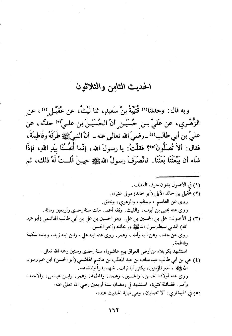 38- وبه قال: وحدثنا قتيبة بن سعيد، ثنا ليثٌ، عن عقيلٍ، عن الزهري، عن علي بن حسين أن الحسين بن علي حدثه، عن علي بن أبي طالب -رضي الله تعالى عنه- أن النبي صلى الله عليه وسلم طرقه وفاطمة، فقال: ألا تصلون؟ فقلت: يا رسول الله، إنما أنفسنا بيد الله، فإذا شاء أن يبعثنا بعثنا. فانصرف رسول الله صلى الله عليه وسلم حين قلت له ذلك، ثم -[163]- سمعته وهو مدبر يضرب فخذه ويقول: {وكان الإنسان أكثر شيءٍ جدلاً} .