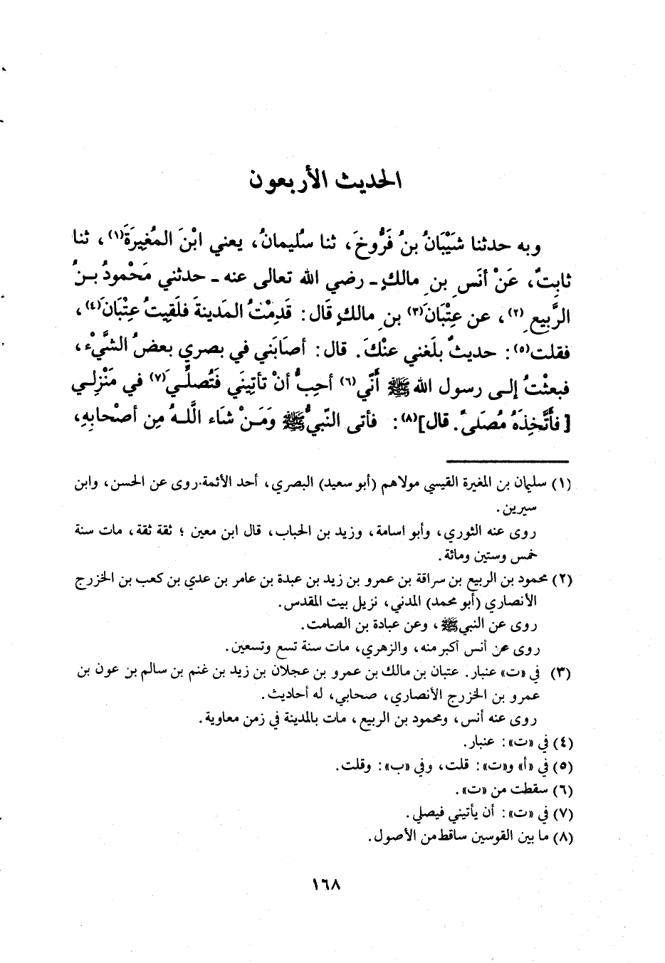 40- وبه حدثنا شيبان بن فروخ، ثنا سليمان، يعني المغيرة، ثنا ثابتٌ، عن أنس بن مالك -رضي الله تعالى عنه- حدثني محمود بن الربيع، عن عتبان بن مالك قال: قدمت المدينة فلقيت عتبان، فقلت: حديثٌ بلغني عنك. قال: أصابني في بصري بعض الشيء، فبعثت إلى رسول الله صلى الله عليه وسلم أني أحب أن تأتيني فتصلي في منزلي [فأتخذه مصلى. قال] : فأتى النبي صلى الله عليه وسلم ومن شاء الله من أصحابه، -[169]- فدخل وهو يصلي في منزلي وأصحابه يتحدثون بينهم، ثم أسندوا عظم ذلك وكبره إلى مالك بن دخشمٍ. قالوا: ودوا أنه دعا عليه فهلك، ودوا أنه أصابه شرٌ. فقضى رسول الله صلى الله عليه وسلم الصلاة، وقال: أليس يشهد أن لا إله إلا الله وأني رسول الله؟! قالوا: إنه يقول ذلك وما هو في قلبه. قال: لا يشهد أن لا إله إلا الله وأني رسول الله فيدخل النار أو تطعمه.