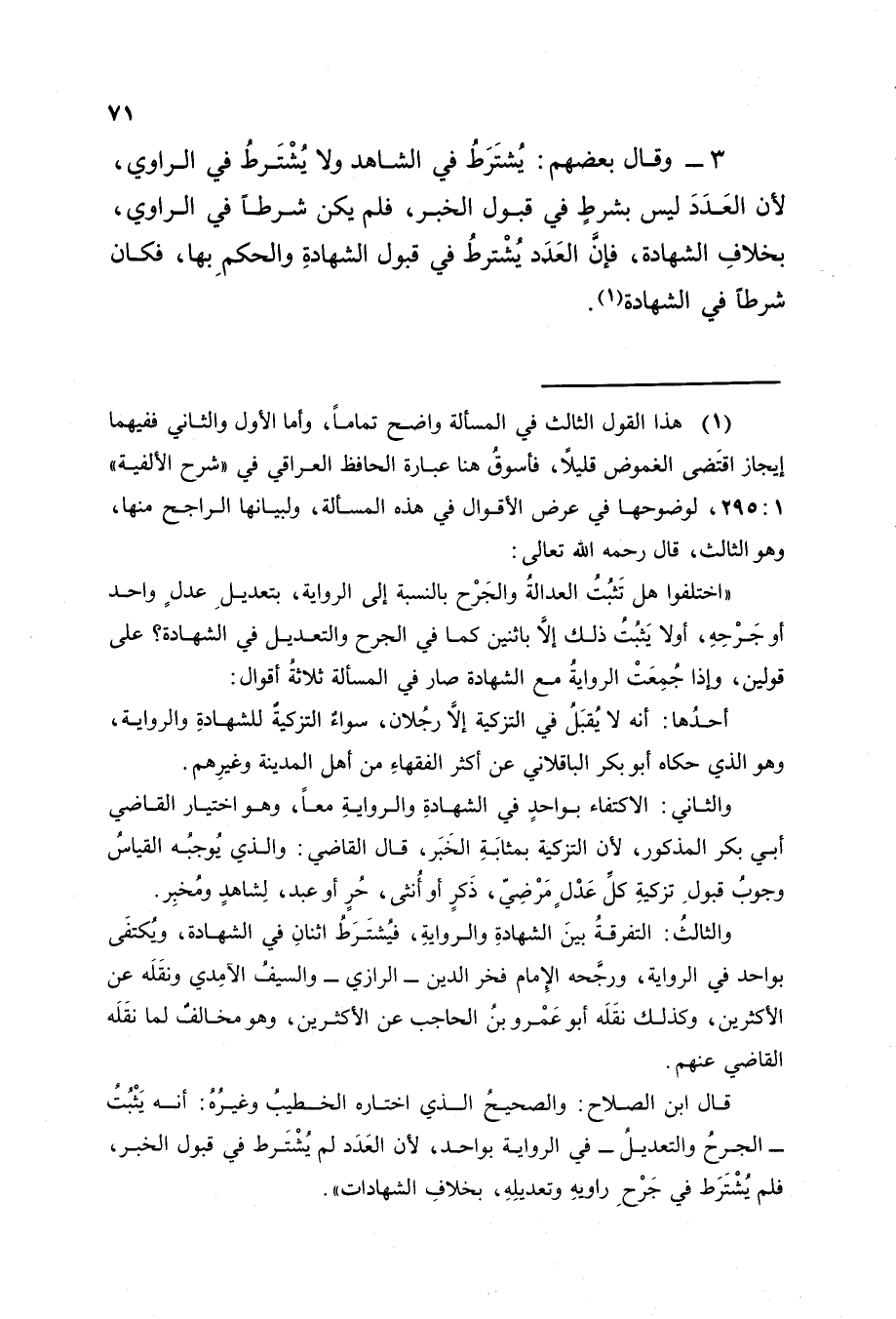 "اختلفوا هل تثبت العدالة والجرح بالنسبة إلى الرواية، بتعديل عدل واحد