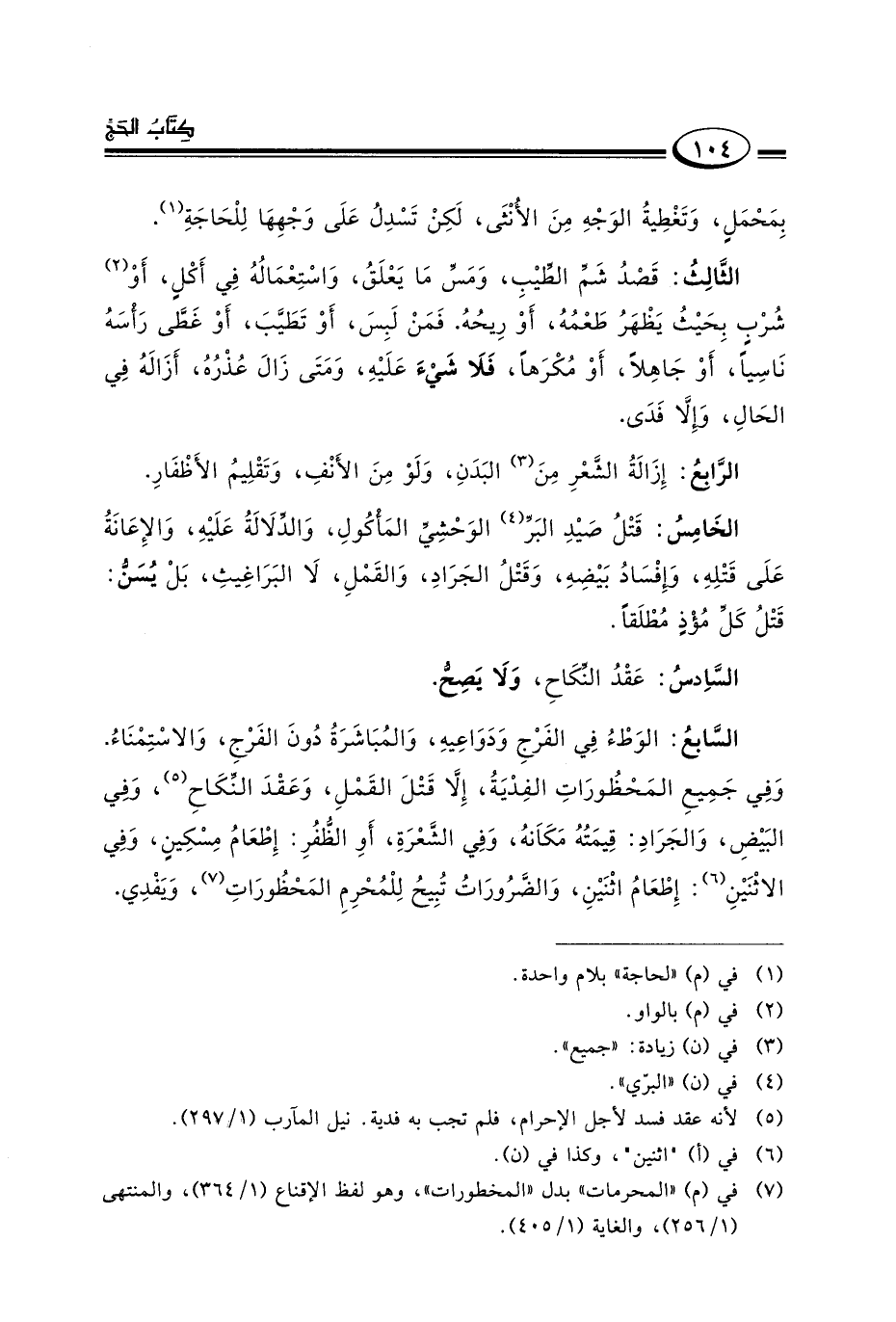 السابع: الوطء في الفرج ودواعيه والمباشرة دون الفرج والاستمناء وفي جميع المحظورات الفدية إلا قتل القمل وعقد النكاح٥ وفي البيض والجراد قيمته مكانه وفي الشعرة أو الظفر إطعام مسكين وفي اثنين٦: إطعام اثنين والضرورات تبيح المحظورات٧ ويفدي.
