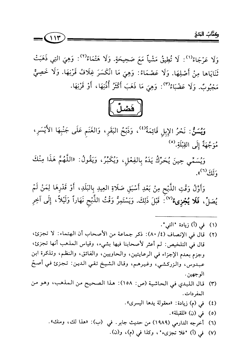 ويسن: نحر الإبل قائمة٤ معقولة يدها اليسرى وذبح البقر والغنم على جنبها الأيسر موجهة إلى القبلة.٥